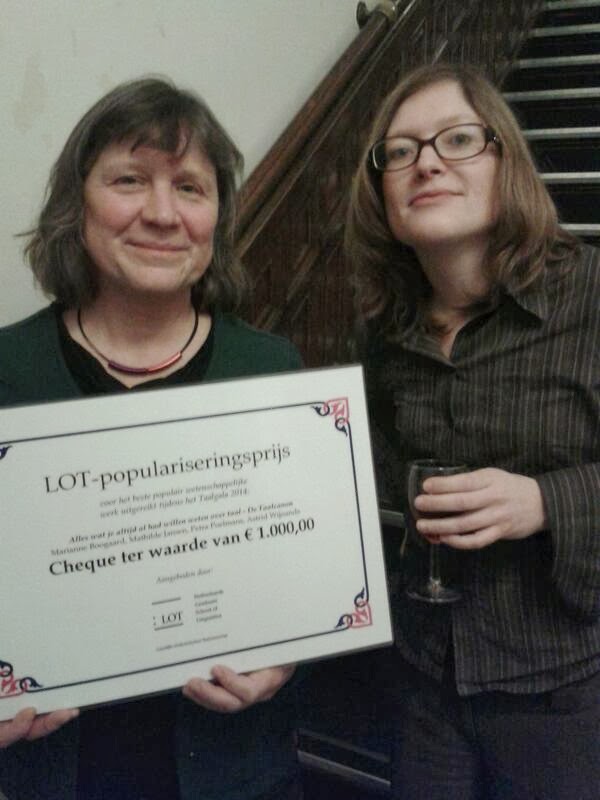 Eerst het nieuws, zoals het hoort: de jaarlijkse LOT-populariseringsprijs voor taalkunde is gisteren toegekend aan de Taalcanon, de website die ook als boek in de winkel ligt onder de titel Alles wat je altijd al had willen weten over taal. De prijs werd in ontvangst genomen door Marianne Boogaard en Mathilde Jansen namens de redactiecommissie, die verder uit Petra Poelmans en Astrid Wijnands bestond.