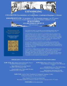 During the colloquium specialists will introduce to a non-specialist audience the situation today of some of the languages described by Witsen, how many speakers there still are, whether these languages are passed on to the next generation, whether and how the languages are described and documented, and how documentation can be realised through field work and be used for the preparation of educational material. To put this into a broader context, guest speaker Nicholas Ostler will present his views on the efforts to revitalize endangered languages. He is the author of several books on related topics and the chairman of the Foundation for Endangered Languages, whose mission it is to support, enable and assist in the documentation, protection and promotion of endangered languages.