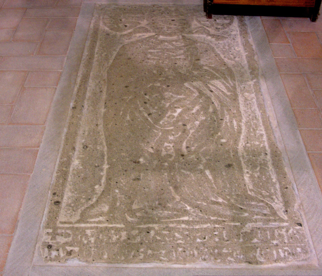 De figuur op de grafsteen is niet gehuld in een bisschopsgewaad maar in een tabbaard, de chique, vaak met bont afgezette kledij van een deftig man in de 15e, 16e en 17e eeuw.