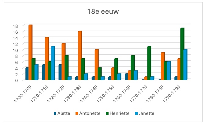 De vier populairste –ette-namen uit de zeventiende eeuw zijn ook in de achttiende eeuw bij ouders het meest in trek. Antonette (en haar spellingvarianten) is nog altijd de onbetwiste nummer 1: 94 dopelingen krijgen die als eerste naam. Bij de andere drie namen zien we een kleine verschuiving. Zo is Alette (20 keer) voorbijgestreefd door Janette (42 keer). Maar het opvallendst is vooral de snelle groei van de naam Henriette, met maar liefst 81 dopelingen.
