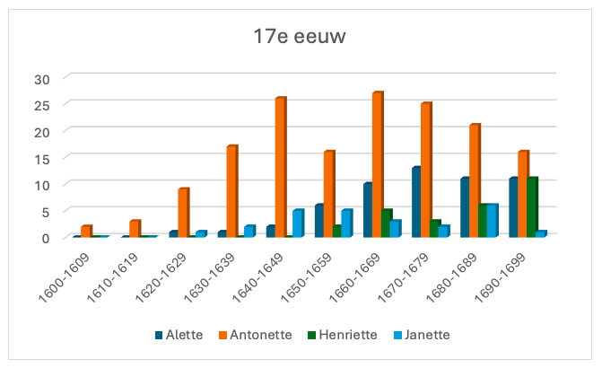 Welke voornamen op –ette waren er nu het populairst in de zeventiende eeuw? Eén naam stak met 162 voorkomens als eerste naam met kop en schouders boven alles iedereen uit: Antonette (en de varianten Antenette, Anthonette, Anthoinette, Antoinette). Daarop volgden Alette (Aelette, Aellette, Allette) met 55, Henriette (Heinderette, Hemdrinjette) met 27 en Janette (Ianette, Jannette, Jenette) met 25 unieke vermeldingen.