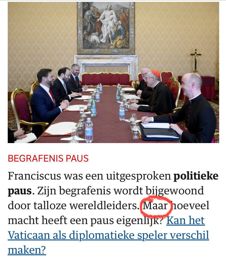 Ik zie het hele probleem niet. De eerste bewering, dat Fransiscus een politieke paus was, suggereert duidelijk dat hij ook politieke macht had. De tweede zin, dat er veel wereldleiders op zijn begrafenis waren, onderstreept die suggestie: de aanwezigheid van veel wereldleiders suggereert politieke macht. En dan volgt de tegenstelling ‘Maar is dat wel zo? Hoeveel macht had die paus eigenlijk?’