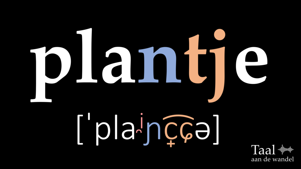 Maar nu die i waar het allemaal om te doen is: waar komt die vandaan? In de uitspraak planjtje zitten twee palatale medeklinkers: de nj-klank en de tj-klank. Zoals die tweede de eerste palataal heeft gemaakt, zo oefent de nj-klank op zijn beurt invloed uit op de klinker ervoor: hij creëert een overgangsklankje tussen de a en zichzelf: plainjtje, of fonetisch [plai̯ɲc̟͡ɕə]. Zo’n i‘tje is een palatale klinker, dus het is heel logisch dat het die klank is die verschijnt. Hieronder hoor je mijn opname van plantje met dat tussenklankje met vervolgens een vertraging van die uitspraak: