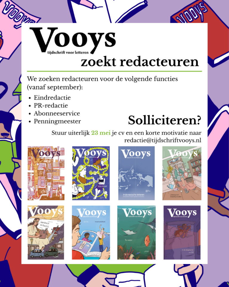 Ben je enthousiast geworden en wil je graag vanaf september deel uitmaken van de Vooys-redactie? Mail dan ten laatste op vrijdag 23 mei een korte motivatie en beknopt CV naar redactie@tijdschriftvooys.nl t.a.v. onze redactiesecretaris Bernadette Feiters.