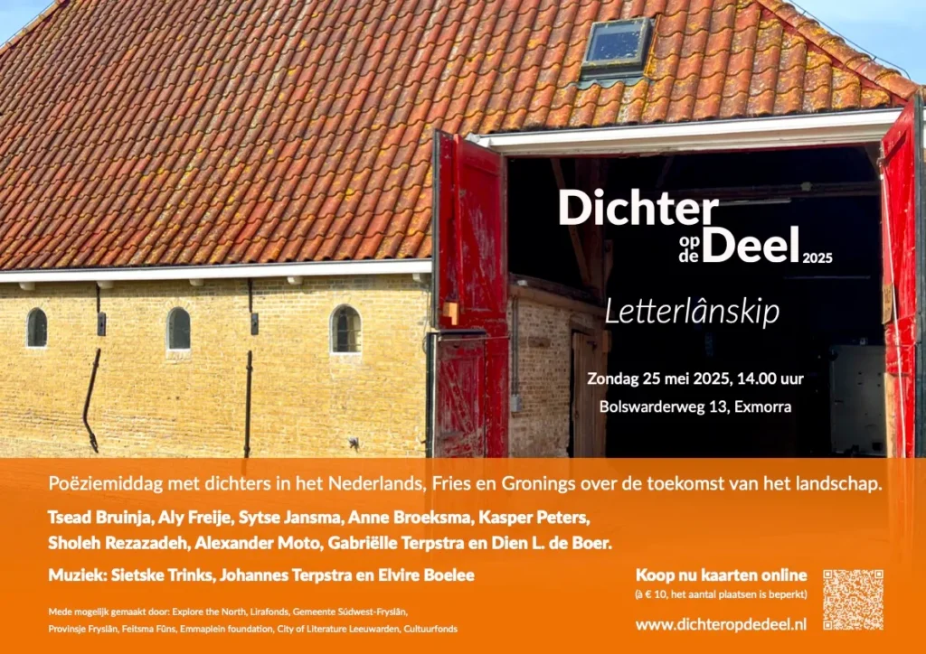 De vorige editie had de titel: ‘De stemmen van het landschap.’ Aantasting van de natuur vormde de rode draad van het programma. Niet dat Dichter op de Deel veranderde van opzet, wel werd er meerwaarde aan gegeven door de poëtische stemmen zich ook te laten richten op klimaatproblematiek. Het is vijf voor twaalf. De natuur kan niet voor zichzelf opkomen, dat moeten wij doen. Temidden van het raaigras van de boerenbedrijven waarboven de vogelzang afneemt, dient de urgentie van het thema zich aan. Nu, voor de editie van 2025, hebben we de titel ‘Letterlânskip’ gekozen om vanuit geraaktheid hoorbaar te maken wat ons zorgen baart.