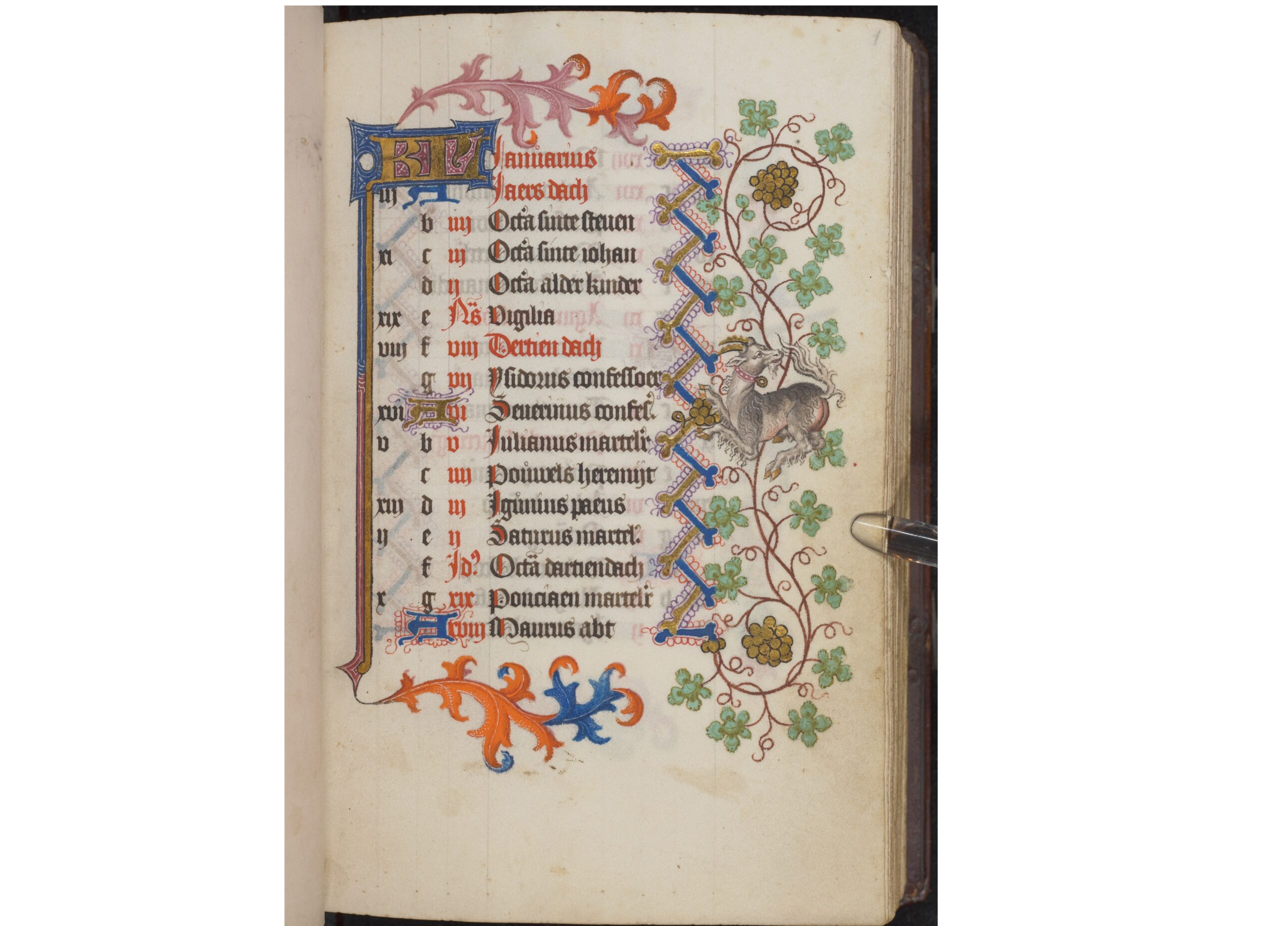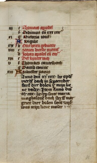 Het onderzoeksproject ‘Pages of Prayer: The Ecosystem of Vernacular Prayer Books in the Late Medieval Low Countries, c. 1380-1550,’ waar ik deel van uitmaak, richt zich op getijdenboeken in de Middelnederlandse vertaling van Geert Grote. Deze boeken bevatten gebedsteksten voor verschillende momenten van de dag. Ze zijn ontwikkeld vanuit koorboeken en brevieren, gebruikt door geestelijken voor het dagelijkse gebed in de kerk. In de Late Middeleeuwen voelden ook leken de behoefte om aan deze gebedscultuur, gericht op de heiliging van de tijd, deel te nemen. Het getijdenboek bood daarvoor een versimpelde versie van het liturgische gebed, aangevuld met een heiligenkalender en gebeden voor verschillende gelegenheden en tot verschillende heiligen. In 1383-84 vertaalde Geert Grote het oorspronkelijke Latijnse getijdenboek naar het Middelnederlands, waardoor de deelname aan het dagelijkse gebed nog toegankelijker werd. Dit getijdenboek werd dé bestseller van de laatmiddeleeuwse Lage Landen, droeg bij aan de democratisering van religie en vormde daarmee een fundamenteel onderdeel van de cultuur en het dagelijks leven. Met hun kalenders, heiligenfeesten en dagelijkse gebedscycli structureerden de boeken de dagen en jaren van hun gebruikers.
