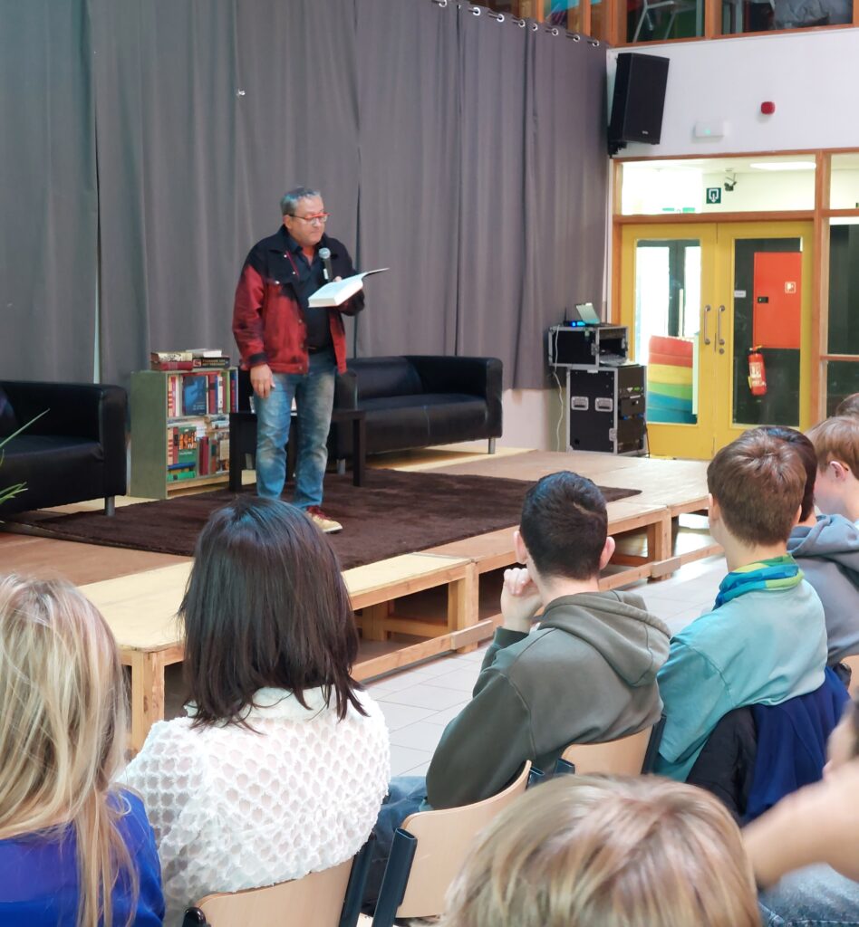 De auteur staat op het speciaal voor dit moment opgezette podium, dat ingericht is met twee sofa’s, een salontafeltje en een boekenrekje met oude boeken. Headset op, boek in de hand en voor zijn neus 200 jonge luisteraars, aan hun stoel en aan zijn stem gekluisterd, gevangen in een verhaal. Setting: geen theaterruimte met professionele belichting en dito techniek, maar een multifunctionele ruimte in onze school. Het publiek: de oudste leerlingen op onze school. De eetzaal/feestzaal/lezingenzaal kan omgetoverd worden tot wat men maar wil. Over een uurtje worden er ballonnen opgeblazen, partytafels gezet en kan de oudleerlingenavond beginnen. Maandagochtend wordt er weer studie gegeven. De woorden van de auteur hangen misschien nog in de lucht, wie weet?