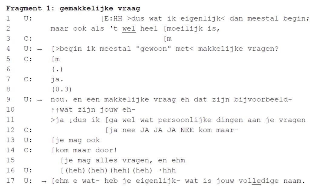 Hieronder volgt een fragment uit het begin van een wilsgesprek. U is de uitvaarbegeleider; C de cliënt. De symbolen geven details weer zoals intonatie, volume, snelheid en pauzes. In de analyse worden de belangrijkste symbolen uitgelegd; een overzicht van transcriptiesymbolen staat onderaan.