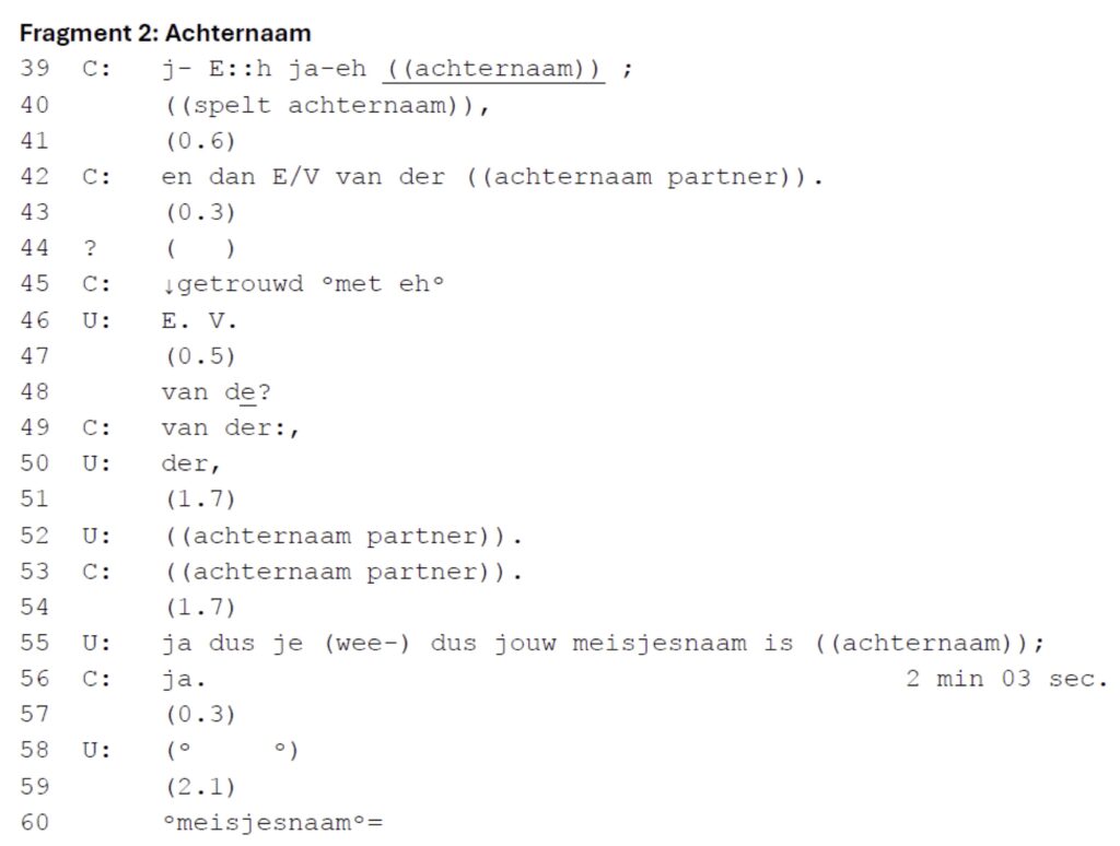 Ook het vervolg laat zien dat beide gespreksdeelnemers moeite moeten doen. Dat is alleen al te zien aan het feit dat ze er nog meer dan honderd regels over doen voor ze het onderwerp wordt afgerond, en ze doorgaan naar de vraag naar het adres. Daar zit ook het spellen van de namen van de cliënt en haar partner bij, en nog een paar verbeteringen. Maar er zijn ook “grotere“ hobbels in het gesprek. Dat is komt aan de orde ná het volgende fragment over de achternaam: