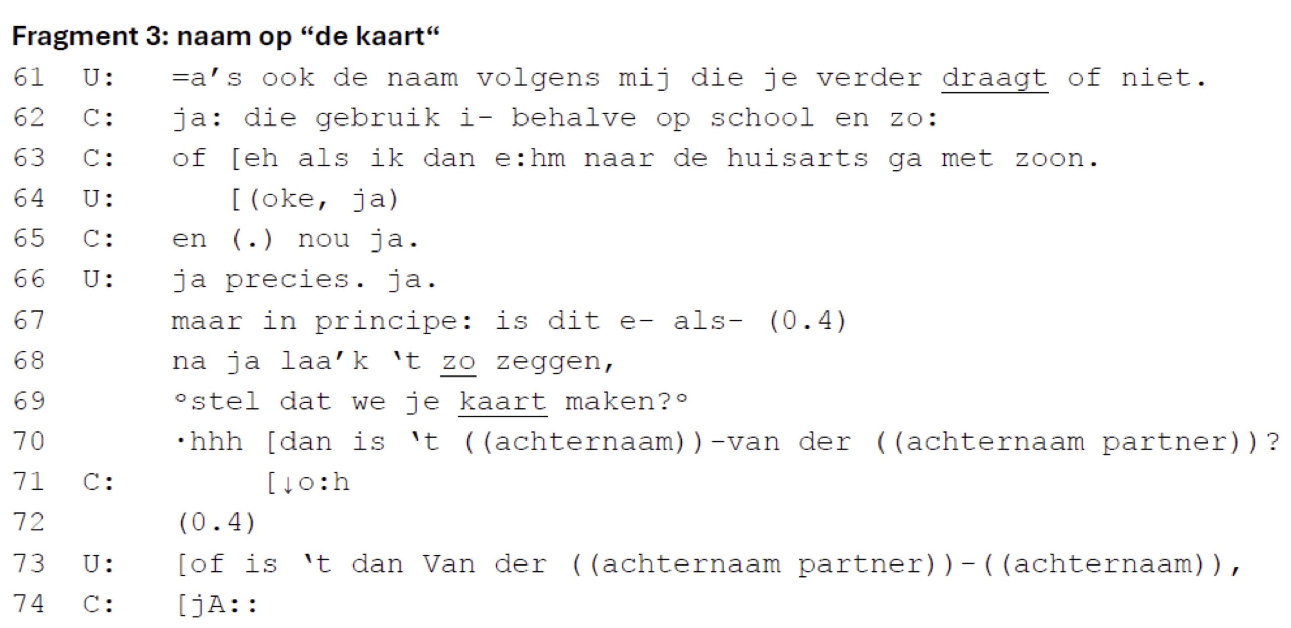 De uitvaartbegeleider probeert eerst uit te vinden of de cliënt vooral haar ongehuwdennaam gebruikt (regel 61). De cliënt bevestigt dit, maar nuanceert dit ook: in bepaalde contexten gebruikt ze haar ongehuwdennaam, en in andere contexten haar partner’s naam (regel 62-64). De uitvaartbegeleider behandelt dit als duidelijk (regel 64, 66). Toch laat “maar in principe” zien in regel 67 dat de uitvaartbegeleider nog niet klaar is om over te gaan op een ander gespreksonderwerp.