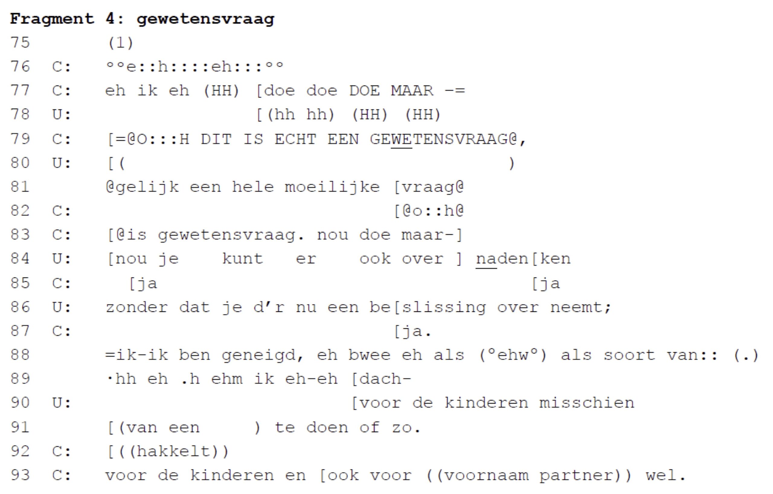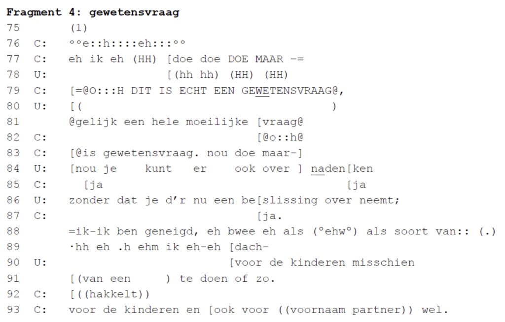 Er volgt een pauze van 1 seconde (en dat is echt lang in een gesprek). Vervolgens “doet” de cliënt denken met een heel langgerekt “eh” (regel 76). Hiermee houdt ze de beurt, maar behandelt de vraag ook als niet direct te beantwoorden. In regel 77 begint ze aan een antwoord, maar onderbreekt dit door een evaluatie van de vraag als “gewetensvraag” (regel 79; zie ook in regel 83).