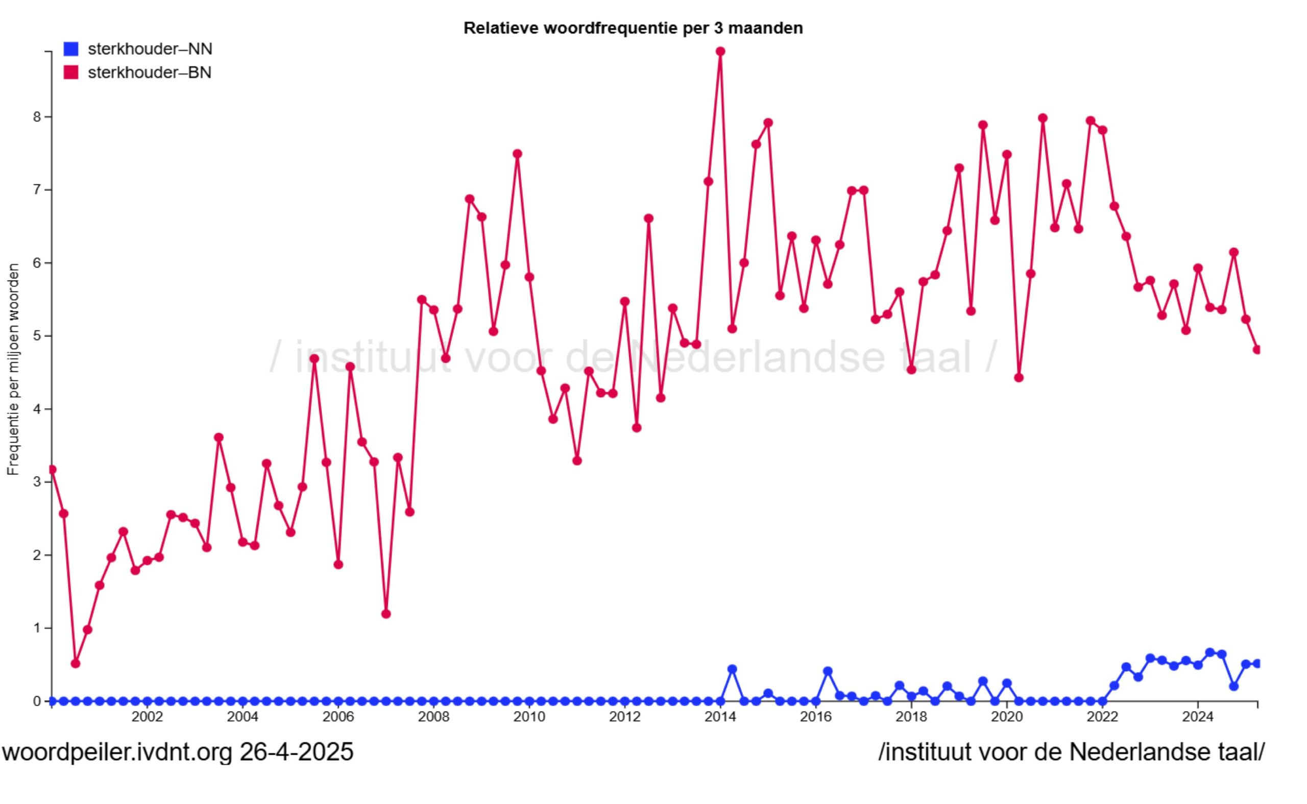 De vorige alinea is pijnlijk neerlandocentrisch: het woord sterkhouder is in het Belgisch-Nederlands namelijk allang heel normaal. Pas recent is het echter de grens met Nederland overgestoken. Dat blijkt uit de Woordpeiler, die laat zien hoe vaak het woord sinds het jaar 2000 in het Corpus Hedendaags Nederlands voorkomt, uitgesplitst naar Belgisch-Nederlandse bronnen (rood) en Nederlands-Nederlandse bronnen (blauw). De Woordpeiler toont dat het woord gedurende de hele 21ste eeuw veelvuldig voorkomt in het Belgisch-Nederlands, terwijl het in het Nederlands-Nederlands inderdaad pas in 2014 zijn intree doet, en pas vanaf 2022 enigszins gesetteld raakt. Daarvoor zijn wellicht de talrijke Belgische voetballers en voetbalcoaches in de Nederlandse Eredivisie verantwoordelijk, denk aan coaches als Harm van Veldhoven, Stijn Vreven, Cartl Hoefkens en René Vandereycken.