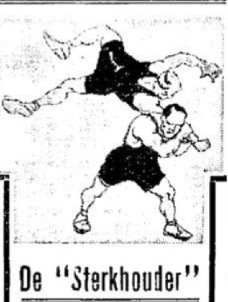 In Belgische kranten wordt sterkhouder al genoemd in 1914, maar de betekenis is daar onduidelijk: er is sprake van zogenaamde ‘sterkhouders’ en ‘afrossers’ die betaald worden door stakingsleiders. Vanaf 1928 komt sterkhouder voor in de context van worstelwedstrijden. In 1939 werd zo’n worstelende sterkhouder in de Volksgazetals volgt uitgebeeld: