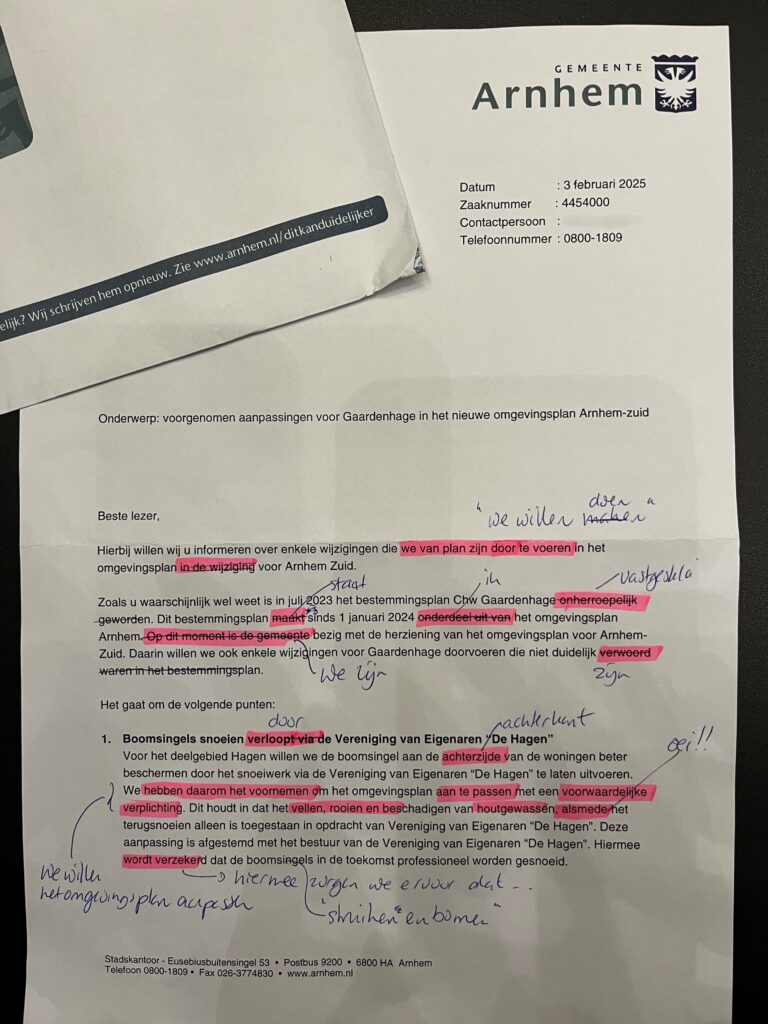 a. “Vellen, rooien, beschadigen van houtgewassen en het terugsnoeien van deze bomen mag dan alleen nog in opdracht van de Vereniging van Eigenaren”: in deze zin staat niet wie er de opdracht van de Vereniging van Eigenaren krijgt en wie er houtgewassen mag vellen, rooie en beschadigen. Ik zou dat willen weten. Een duidelijker formulering is: “U mag houtgewassen alleen rooien en beschadigen en u mag bomen alleen terugsnoeien, als de Vereniging van Eigenaren u dat heeft opgedragen” (althans, als dat de bedoelde lezing van de zin is, want dat is dus niet duidelijk).