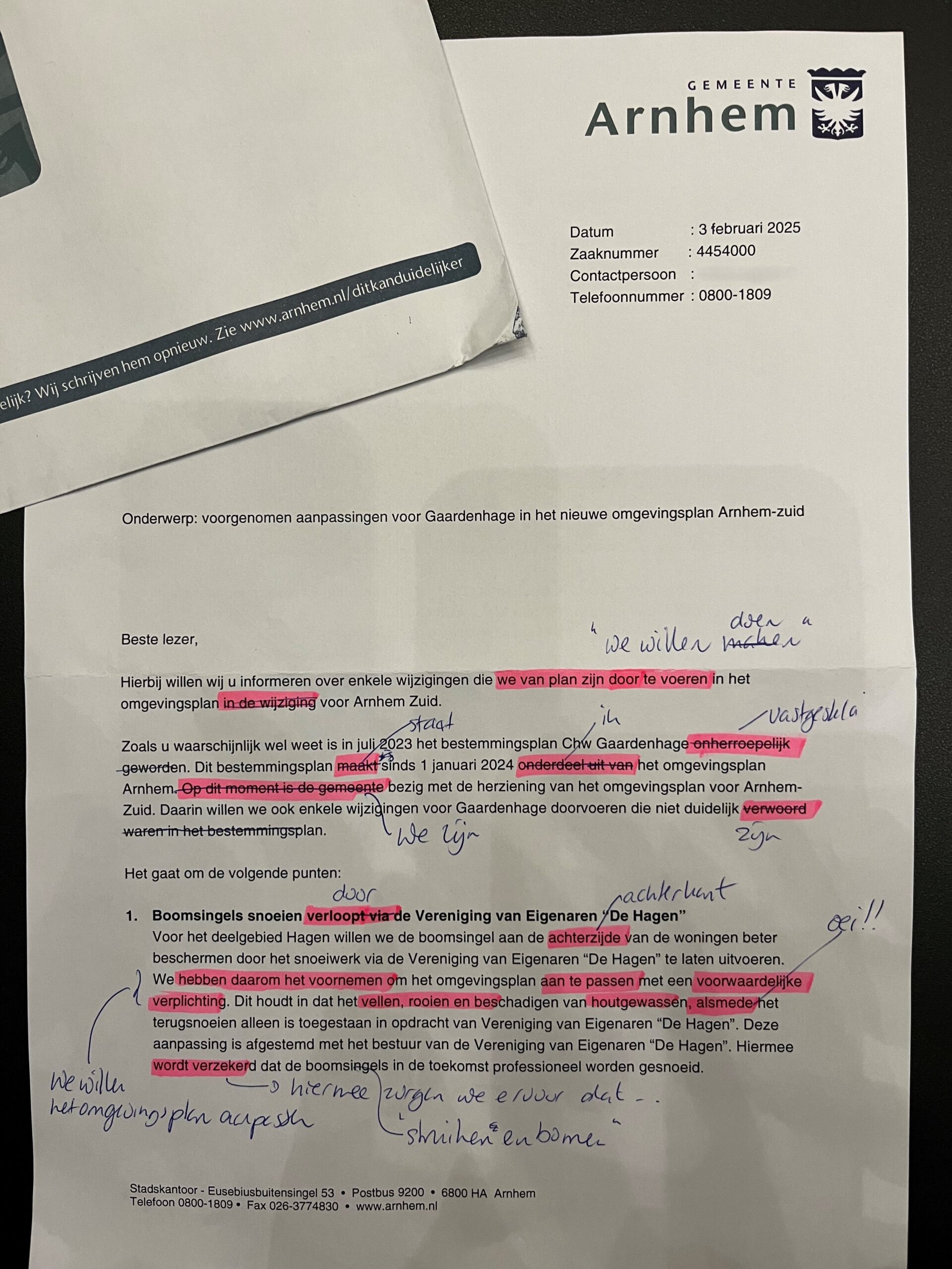 In de zin “Vellen, rooien, beschadigen van houtgewassen en het terugsnoeien van deze bomen mag dan alleen nog in opdracht van de Vereniging van Eigenaren” staat het woordje “dan” en dat verwijst nergens naar terug. De lezer moet zelf puzzelen en bedenken dat het gelezen moet worden als: “als we het omgevingsplan hebben aangepast”. Ook de woordgroep “deze bomen” verwijst nergens naar terug. Er worden immers geen bomen genoemd. De lezers moeten raden of de ambtenaren met “deze bomen” en de eerder genoemde “houtgewassen” hetzelfde bedoelen.