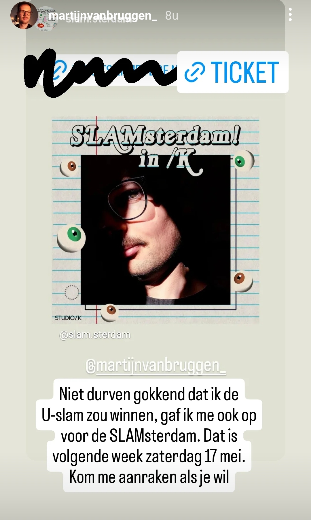 Toen Martijn van Bruggen zich opgaf voor SLAMsterdam wist hij nog niet dat hij vlak daarvoor de U-slam zou winnen. In de woorden van Martijn op Instagram: