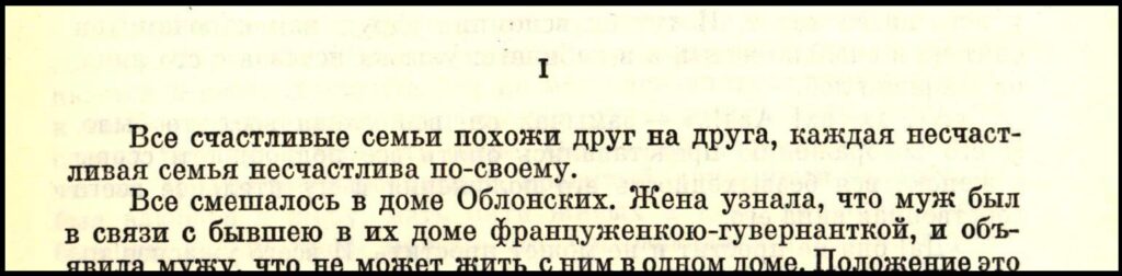 Ik moet tegelijkertijd ook denken aan de beroemde openingszin of liever gezegd -zinnen van Anna Karenina, die respectievelijk beginnen met alle (все) en alles (всё), en verletterlijkt (verwoordvoorwoord) in het Nederlands luiden: ‘Alle gelukkige gezinnen lijkende elkaar op elkaar, ieder ongelukkig gezin ongelukkig apart.’ en ‘Alles vermengd in huis der Oblonski’s.’ – hetgeen meestal wordt vertaald als iets als: ‘Alle gelukkige gezinnen lijken op elkaar, ieder ongelukkig gezin is ongelukkig op zijn eigen manier.’ en ‘Alles was in de war in huize Oblonski.’