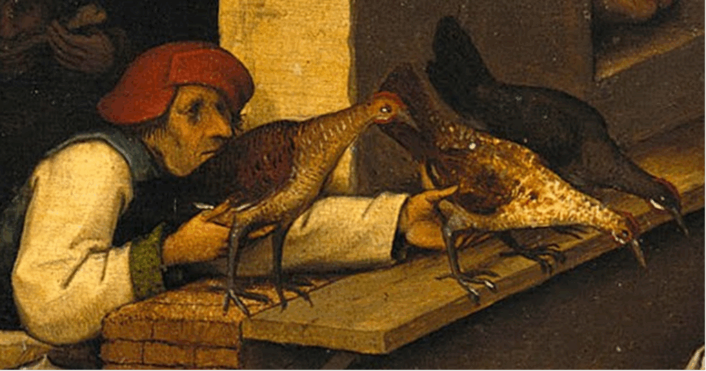 - De leerlingen kunnen de voorstelling van de ‘hennentaster’ op het spreekwoordenschilderij van Pieter Bruegel de Oude herkennen en de verschillende betekenissen ervan verklaren.