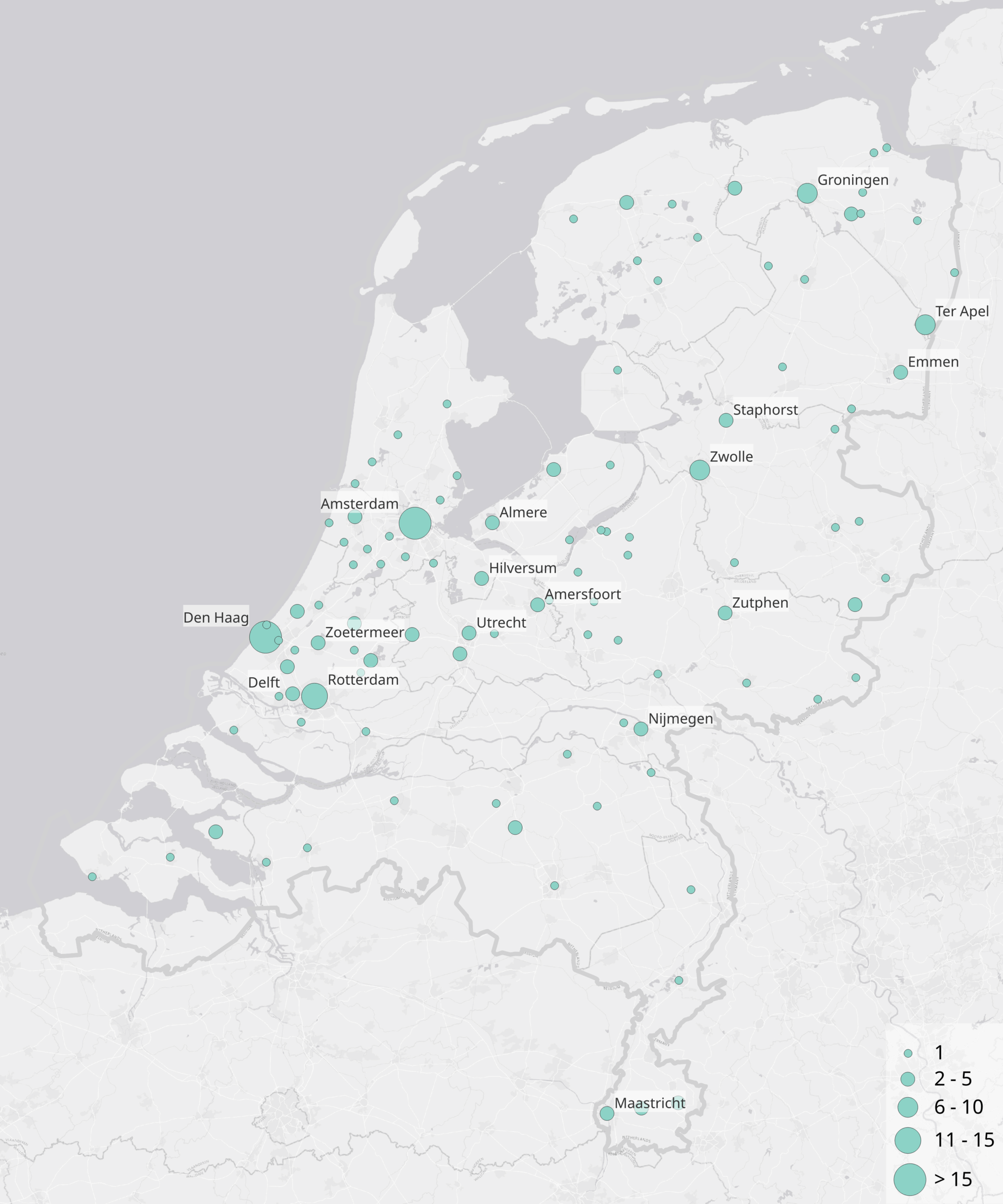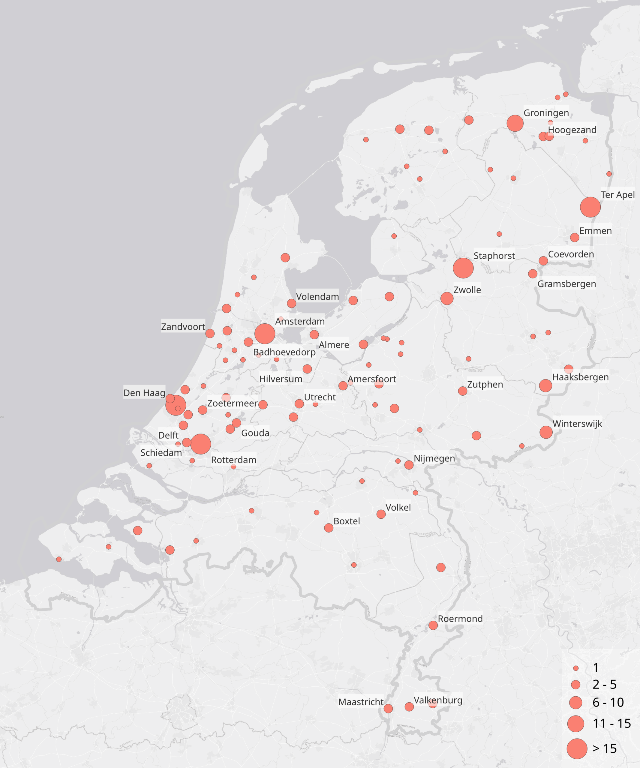 Als we naar de frequenties zonder herhalingen kijken zijn het vooral (locaties binnen) de drie grote steden (Amsterdam, Den Haag en Rotterdam) die vaak genoemd worden. Wanneer we naar de frequenties inclusief herhalingen kijken valt op dat er ook veel voorkomens zijn van Staphorst, Ter Apel en Groningen. Voor deze plaatsen geldt dat zij sterk verbonden zijn met een bepaald nieuwsfeit of probleem. De plaatsnaam wordt soms zelfs als label voor het probleem gebruikt zoals in onderstaande voorbeelden.