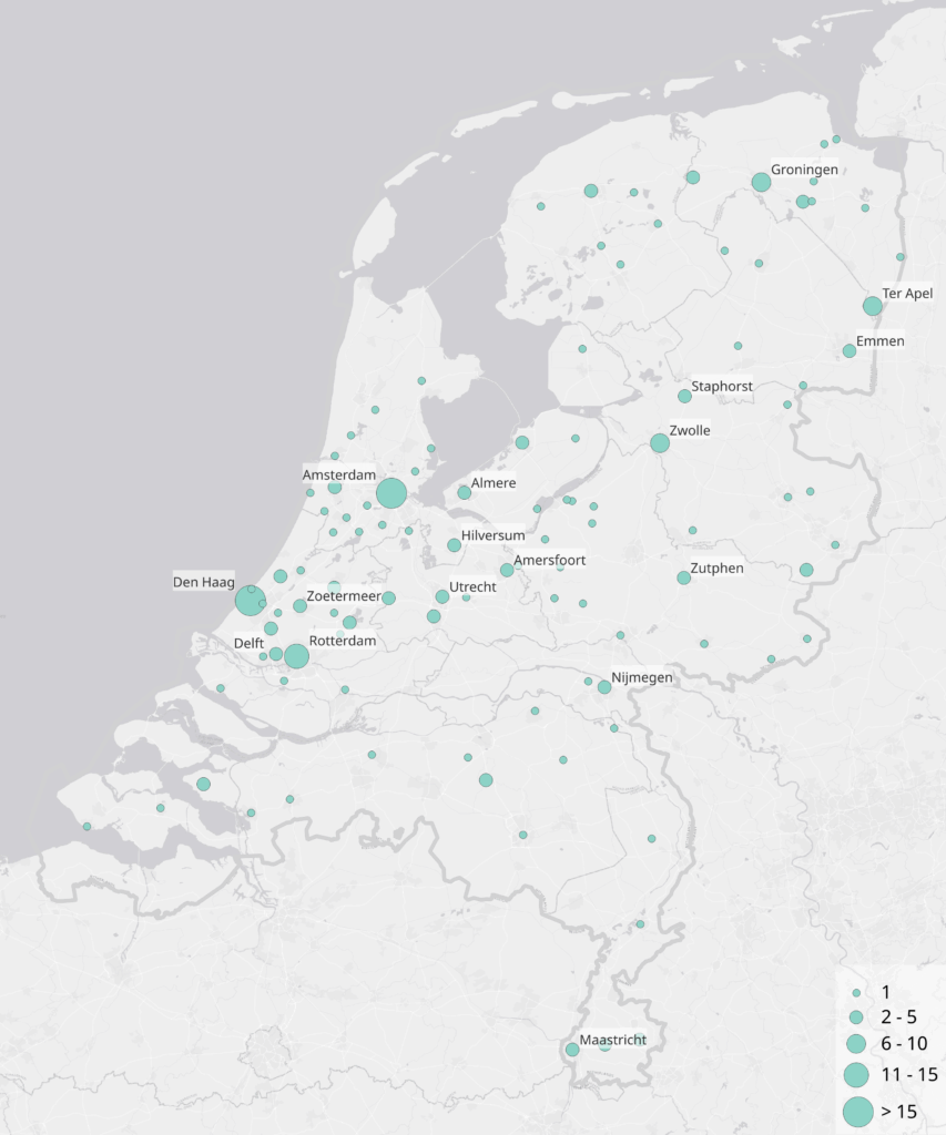 We hebben voor de drie bovengenoemde satirische nieuwsprogramma’s bekeken hoe er gesproken wordt over plaatsen, locaties of gebieden binnen en buiten de Randstad: De Avondshow met Arjen Lubach (DAMAL; seizoen 2, 36 afleveringen uitgezonden tussen 5 september en 3 november 2022), Dit was het nieuws (DWHN; seizoen 44, 7 afleveringen, uitgezonden tussen 1 september en 27 oktober 2022) en Even tot hier (ETH; seizoen 8, 7 afleveringen, uitgezonden tussen 12 november 2022 en 1 januari 2023). Eerst wat getallen. In totaal is in de geanalyseerde afleveringen voor de drie programma’s 557 keer verwezen naar een plaats (d.w.z. wijk, stad, dorp, provincie, regio of elke andere locatie die op een kaart aan te wijzen is) in Nederland. Een eenduidige definitie van de Randstad ontbreekt. In beleid wordt de term vaak gebruikt om naar een stedelijk netwerk te verwijzen, waar de steden Amersfoort, Amsterdam, Den Haag, Dordrecht, Haarlem, Hilversum, Leiden, Rotterdam en Utrecht onder vallen. Onderstaande tabel laat zien dat, gebaseerd op deze definitie, een kwart van alle genoemde locaties in Nederland de Randstad betreffen.