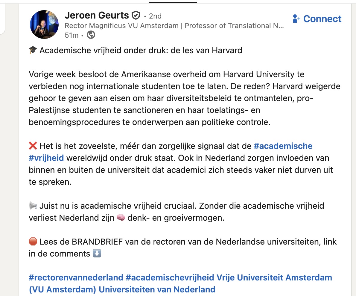 Geurts is een intelligente én sympathieke man, en veel meer in touch met de tijdgeest dan ik, maar ik vind dit er juist door die precies geplaatste emoji (een neurowetenschapper die denkvermogen illustreert met een hersenemoji) er te gelikt uitzien. Ik weet zeker dat hij zo’n posts zelf uitmaakt, maar voor mij ziet dit eruit als het product van de communicatie-afdeling. Een mens doet dat toch niet, zo’n baret plaatsen bij een hartekreet over academische vrijheid?