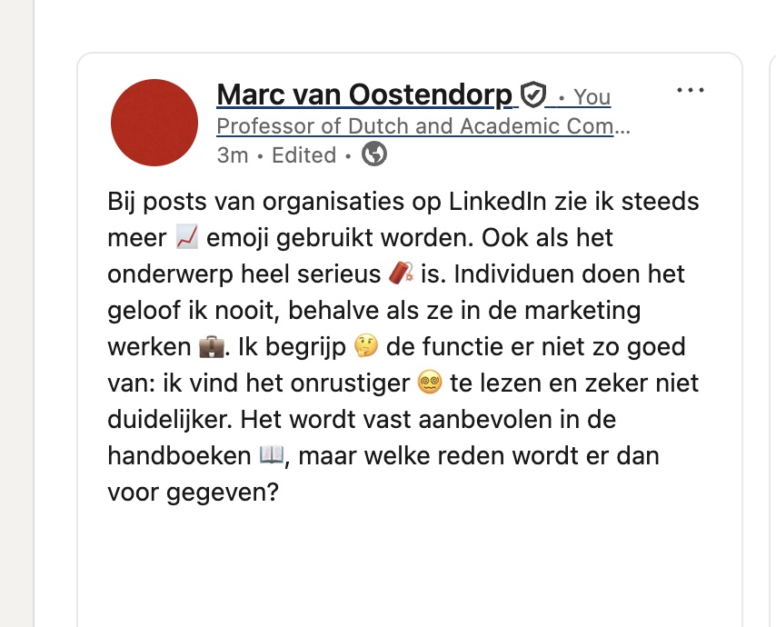 Het vereist een zeker vernuft om wat er gezegd wordt samen te vatten in een emoji. Ik weet niet zeker of het er echt duideliker voor wordt. ik lees een aankondiging als die hierboven te snel om het loepje te associëren met ‘reflectie’. Ik vermoed dat het vooral gaat om het visuele aspect. Dat in eerste instantie iemand heeft bedacht dat het er zo echt jong of toegankelijk uitziet, en dat het inmiddels tot de handboeken is gaan horen van hoe je zoiets moet doen op LinkedIn. (Op de site waarop Neerlandistiek draait, kun je niet eens zulke emoji gebruiken, ik krijg allemaal foutmeldingen als ik het probeer.)
