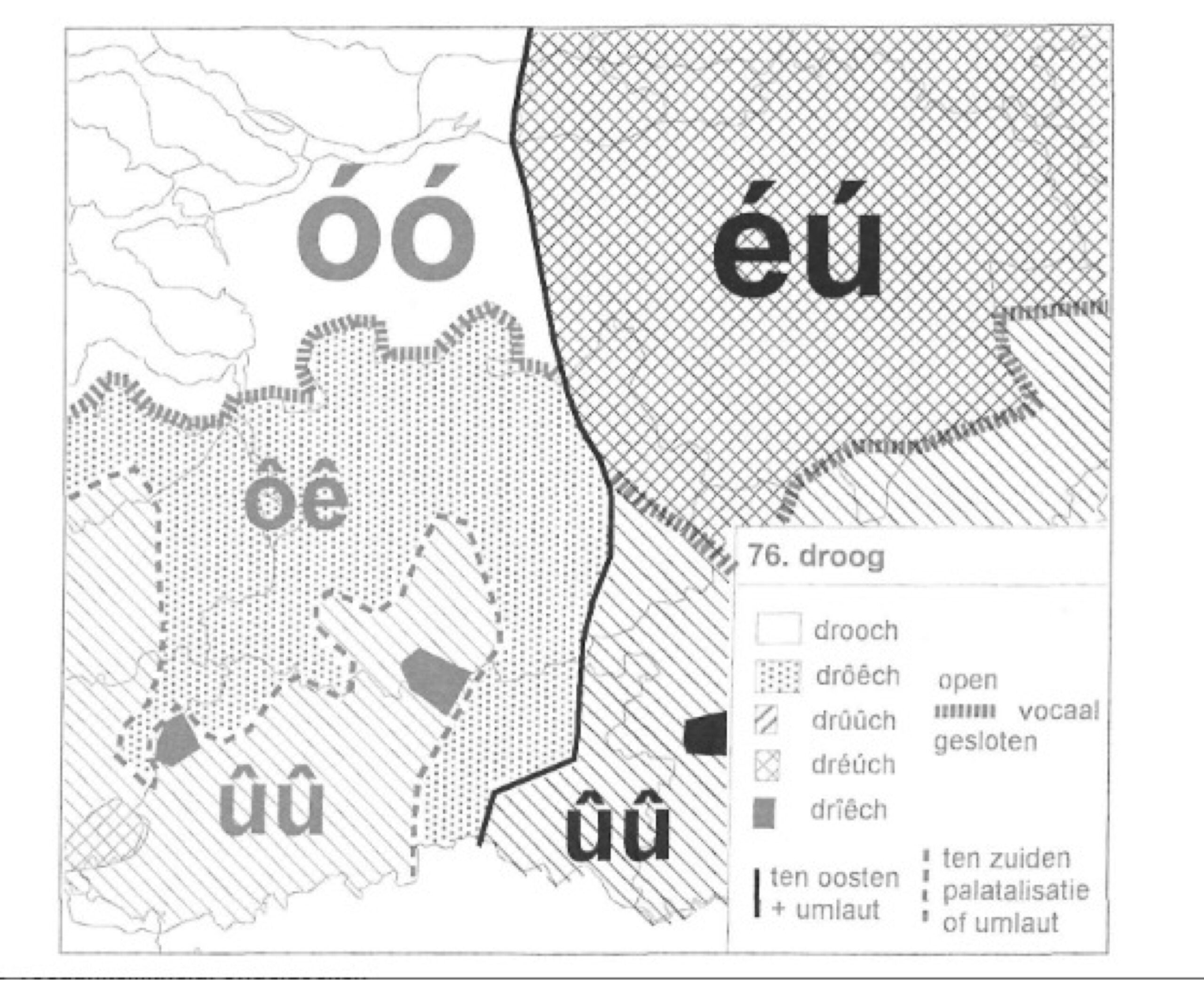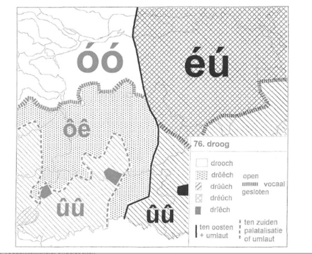 We zien dat de grens van het gebied waar het woord droog dreug wordt danwel droog blijft ongeveer over het gebied van Genderen en Drongelen loopt. Zou deze dialectgrens de oo-klank in Drongelen (behalve bij Ruede) en de eu-klank in het oostelijker Genderen verklaren? Waarbij we dan de vraag waarom in de Meijerij de Rode-toponiemen wel hun oo-klank behielden buiten bespreking laten. Dat er in Genderen een Reukes-toponiem was is te verklaren vanuit taalontwikkelingsgegevens en dialectkennis.