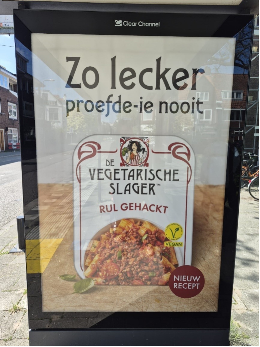 Veel bedrijven produceren eten, zo ook “De vegetarische slager”. Dat bedrijf heeft zijn vegetarische gehakt vernieuwd en wil dat onder de aandacht brengen met het volgende reclamebord.