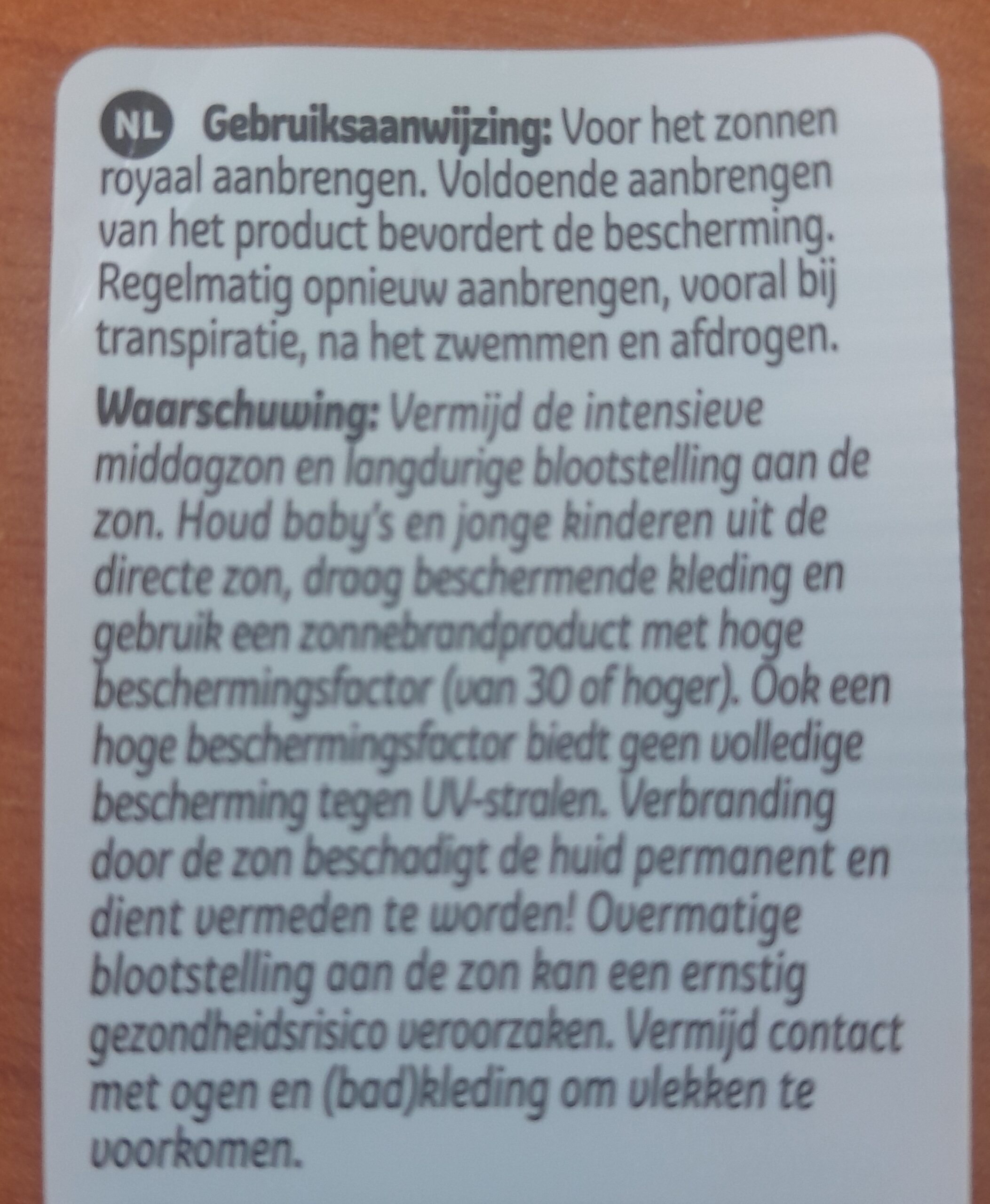 Ik trok het etiket op de achterkant los, op aangeven van een pijltje aan de voorkant, en trof daar in het Nederlands ‘Gebruiksaanwijzing’ en ‘Waarschuwing’ aan. Onder de eerste kop gaat het om royaal en regelmatig aanbrengen; onder de tweede staan allemaal dingen over het risico van blootstelling aan de zon, bijvoorbeeld: