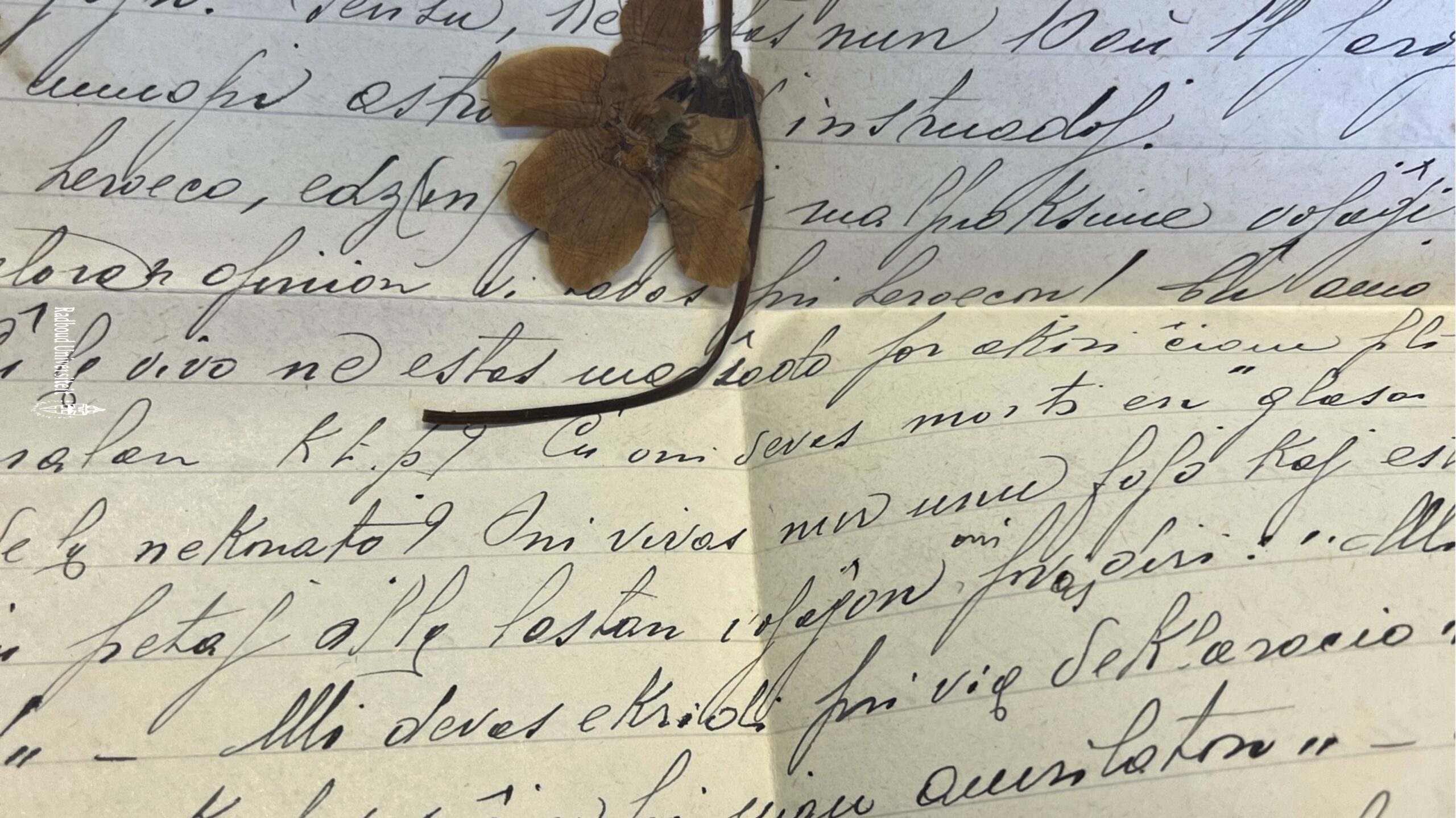 Ada schrijft vloeiend Esperanto, met slechts hier en daar een foutje. Ik weet niet waar ze het geleerd heeft. Als haar vader ook een keer een briefje schrijft, doet hij dat in het Italiaans en levert zij een vertaling. Ze vertrouwt Eduard toe dat ze maar weinig contact heeft met de lokale club, en toch bereikt zij al vanaf het begin van de briefwisseling een hoog stilistisch niveau. Haar zinnen laten niet alleen de kracht van haar gevoelens zien, maar ook haar gevoel voor de esthetiek van haar tijd. Elke brief is een kunstwerkje — door haar stijl, haar handschrift, de bloemetjes die ze tussen de blaadjes laat drogen (en die je nog steeds kunt voelen en ruiken). Ada’s Esperanto is vloeiend en genuanceerd. Haar brieven vertellen over de eenzaamheid van een jonge vrouw (ze moet een jaar of 19 zijn geweest), over hoop, over de ruimte tussen brieven en haar verlangen naar de fysieke aanwezigheid van haar vriend. Zij spreken ook nu nog rechtstreeks tot de lezer.