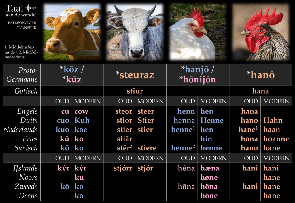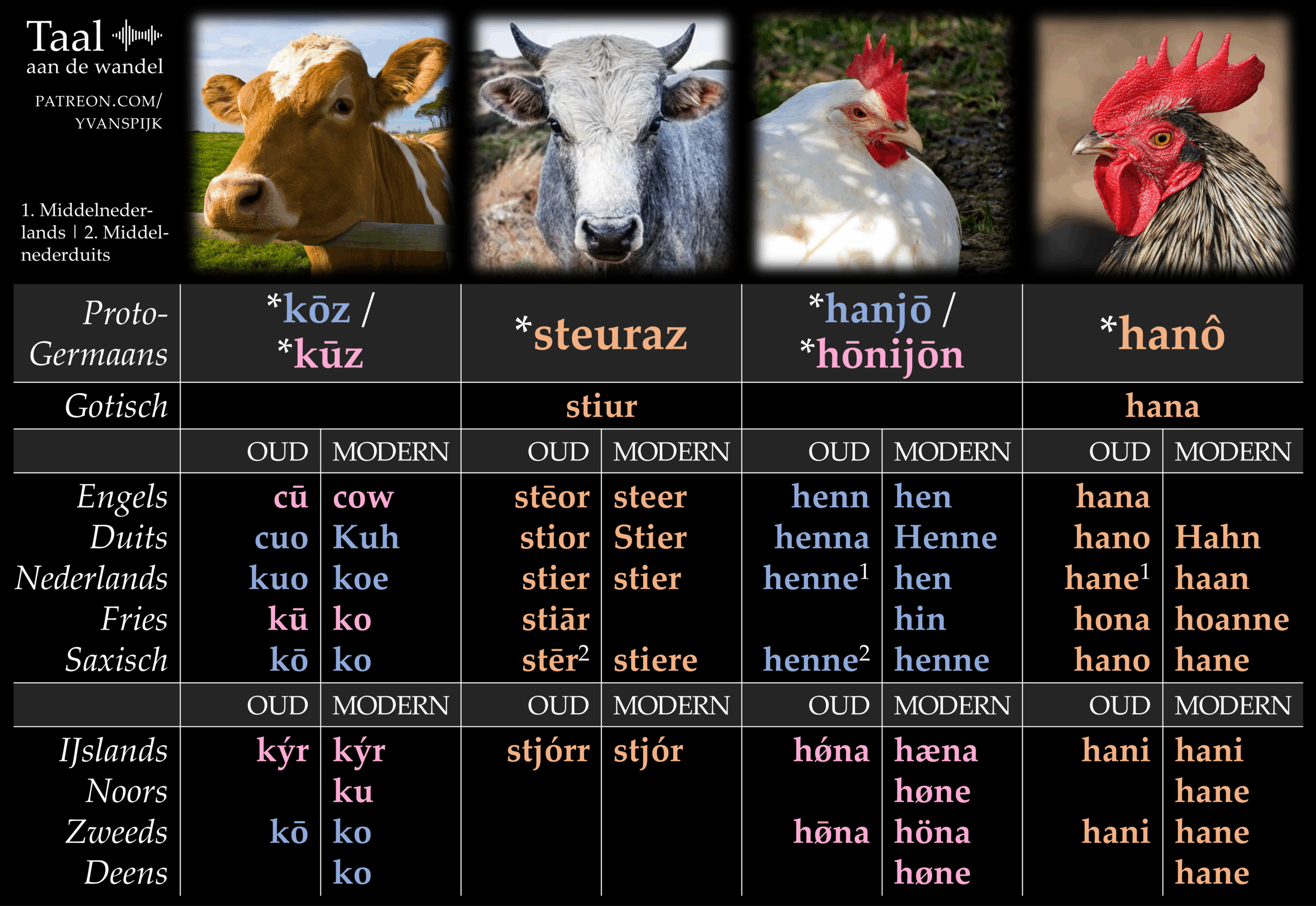 Een noot vooraf: de vier afbeeldingen zijn gericht op de etymologie. Welke nazaten heeft bijvoorbeeld het Proto-Germaanse *steuraz (‘stier’) gekregen? De woorden die je ziet in de moderne taalfases, zijn dus niet per se de huidige woorden voor dat dier. Na de vier afbeeldingen vertel ik meer over deze kwestie en andere aspecten.
