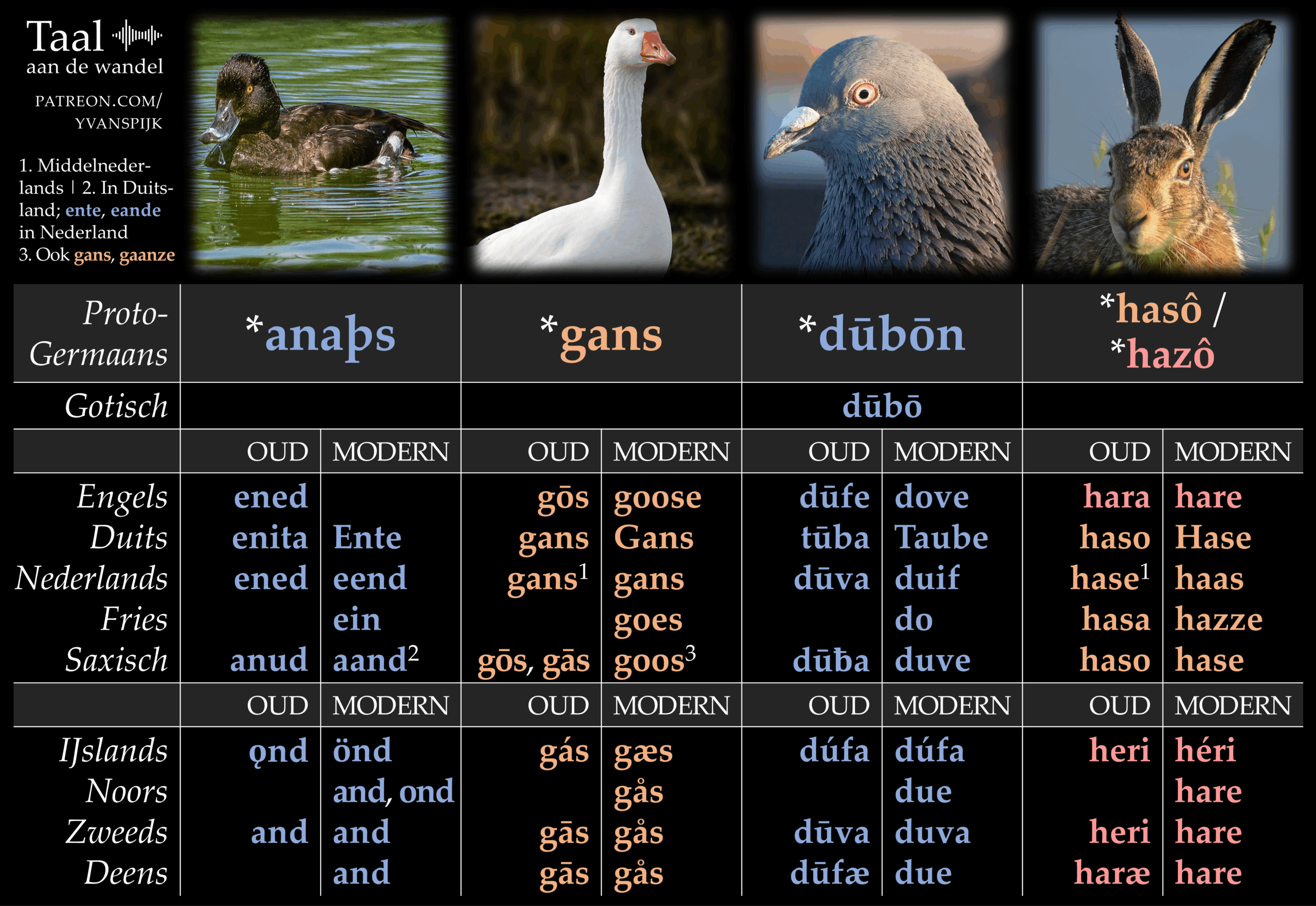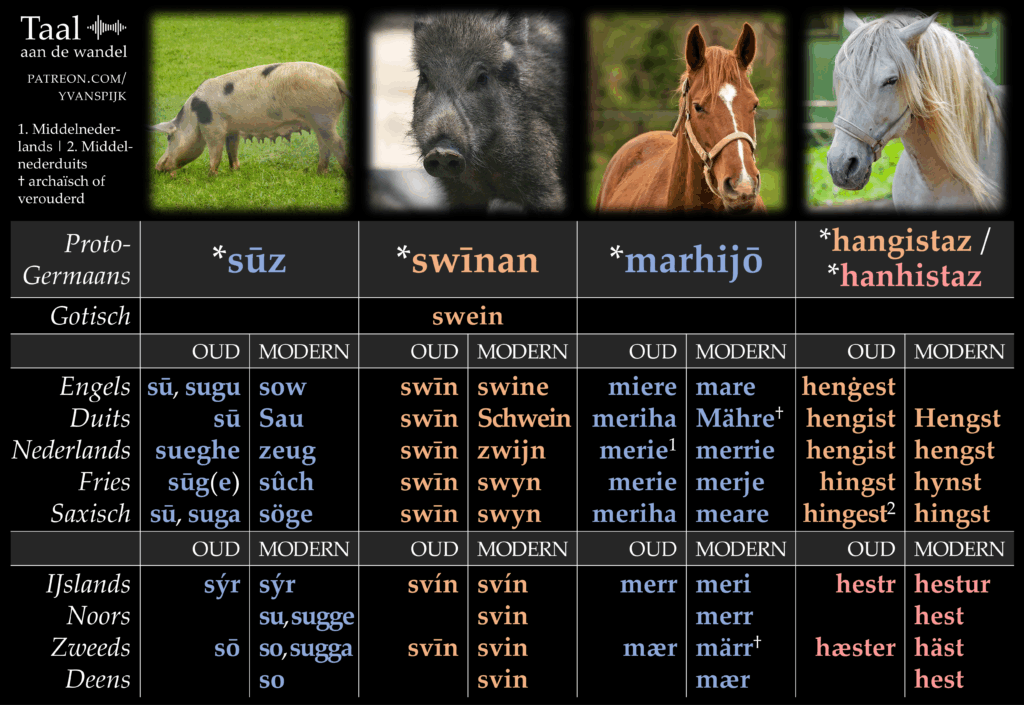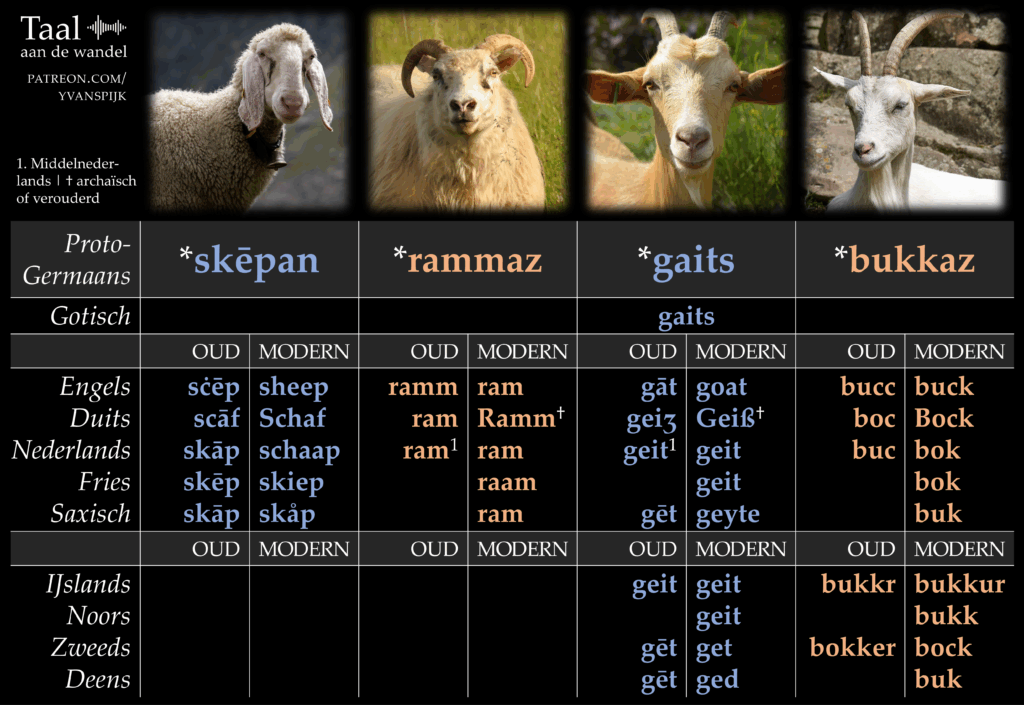 Tweeduizend jaar geleden waren er natuurlijk nog geen kinderboerderijen, maar de woorden voor de dieren die je in die minidierentuinen vindt, bestonden toen al. Ze zagen er alleen nog heel anders uit. In dit artikel vind je vier infographics, die de Proto-Germaanse reconstructies tonen van zestien woorden voor dieren. En dat niet alleen: je ziet op deze afbeeldingen ook de nazaten in de tien grootste Germaanse talen – in hun huidige vorm én hun middeleeuwse.