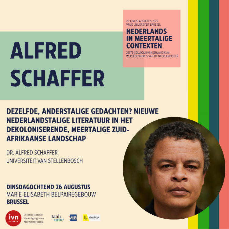 Op dinsdag 26 augustus geeft Alfred Schaffer de eerste keynotelezing van het 22ste Colloquium Neerlandicum: Dezelfde, anderstalige gedachten? Nieuwe Nederlandstalige literatuur in het dekoloniserende, meertalige Zuid-Afrikaanse landschap.