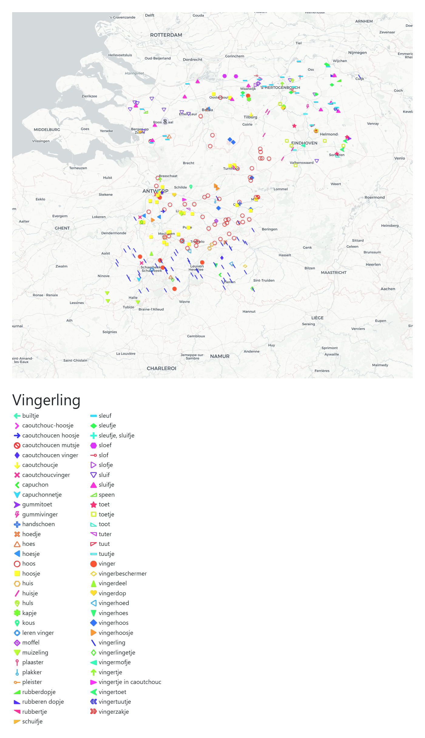 In de Nederlandse dialecten komen nog andere benamingen voor. Het WNT vermeldt sluif(je) en sloop voor Rotterdam, slop voor Groningen, en (linnen) schuitje en sluim voor Vlaamse dialecten. Het begrip ‘vingerling’ (vingerverband) is ook afgevraagd in het Woordenboek van de Brabantse Dialecten, en kent, zo blijkt uit de Database van de Zuidelijk-Nederlandse Dialecten (DSDD), een groot aantal benamingen, met vingerling en hoos(je) als meest voorkomende, zie hieronder.