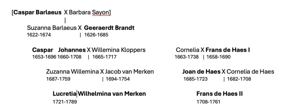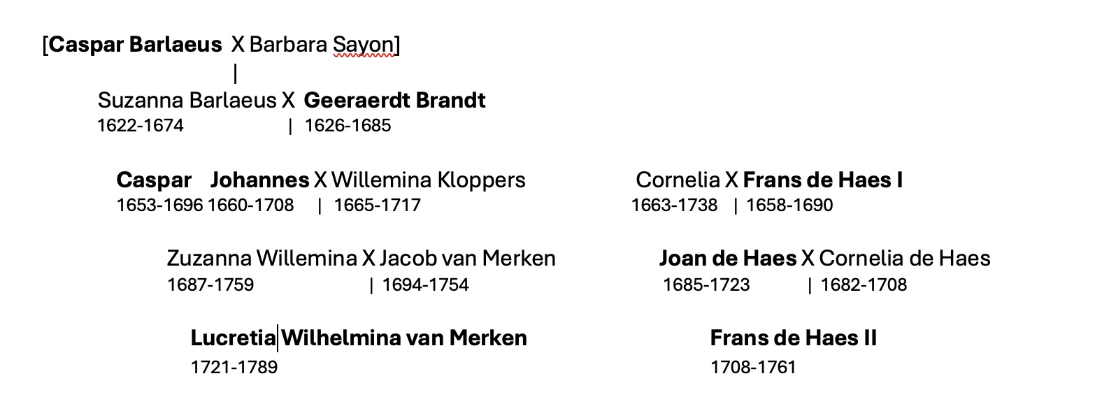 Om de zaak een beetje behapbaar te maken heb ik het werkterrein beperkt tot één familie die door die hele periode heen dichters leverde, en waarvan Geeraerdt Brandt en Suzanna van Baerle vaak als stamouders worden genoemd. Hierbij een sterk ingekort schema.