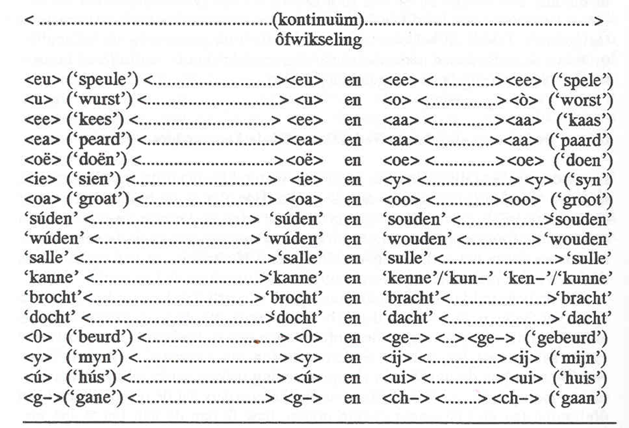De ferline jier ferstoarne William Labov hat yn de jierren sechtich fan de foarige iuw mei fernijend ûndersyk wiisd op de fariabiliteit yn taalgebrûk; dialektale foarmen wurde net hieltyd konsekwint brûkt yn sprektaal, mar ôfwiksele mei standertfoarmen. Hy lei dat fêst yn de saneamde fariabele regel, sintraal yn de sosjolingwistyk. Foar it Feensters soe dat ynhâlde dat der in kontinuüm bestiet tusken it dialekt en it Nederlânsk, dêr’t de Feenster op hinne en wer skowe kin; soms hiel frekwint mei Feenster foarmen, dan wer hielendal sûnder (Sjoch skema 3).