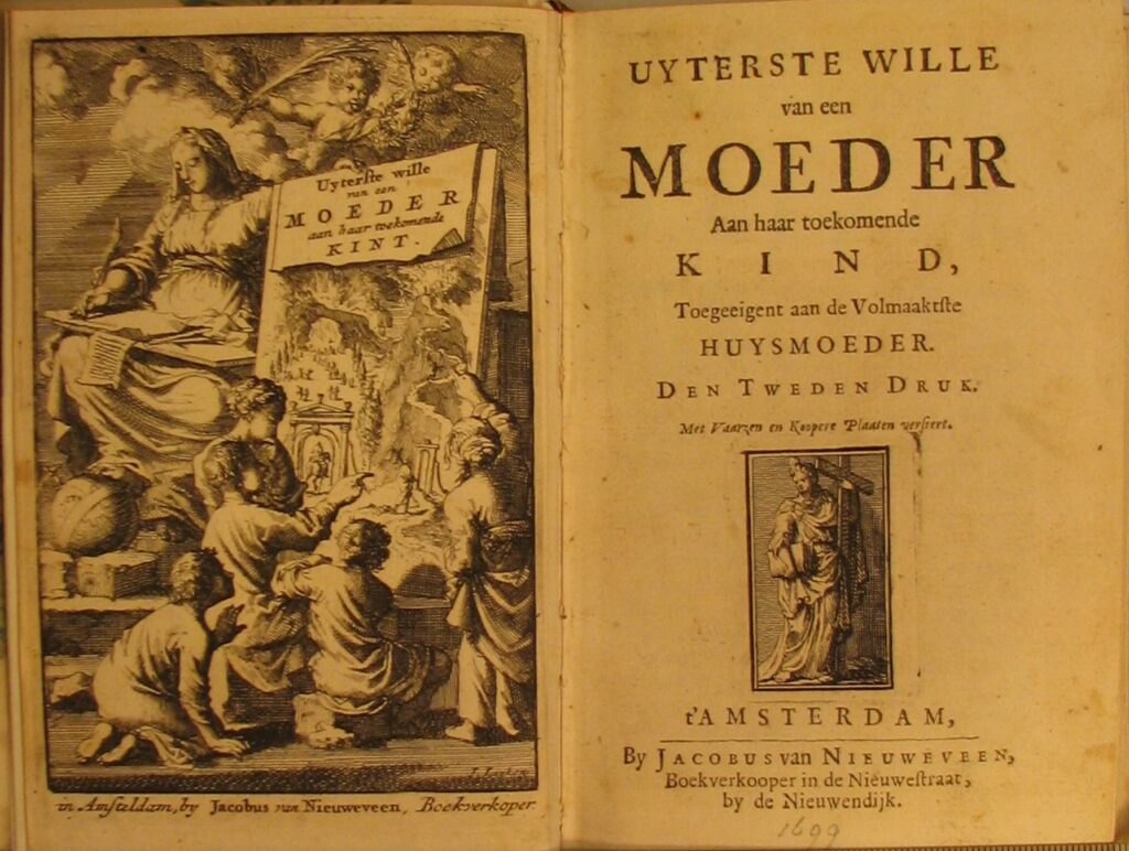 Het beroemdste Engelse voorbeeld is de ‘mother’s legacy’ van Elisabeth Jocelin uit 1624. Dit werk is ook in het Nederlands vertaald, en uit systematisch doorspitten van de STCN blijkt dat er ook origineel Nederlandse voorbeelden bestaan. Aan het eind van de zeventiende eeuw lijkt er, na de publicatie van een vertaling van Jocelin doorspekt met emblemata en muziek, zelfs sprake te zijn geweest van een kleine hype: kort daarna worden ook de eerdere Nederlandse moederlijke testamenten opnieuw uitgegeven. Hopelijk hierover later meer, want wat ik nu natuurlijk wil gaan uitzoeken is: wat schreven die moeders in hun testamenten, hoe verhield dat zich tot hun verdere schrijverschap, als daar sprake van was, en hoe verhield dat zich tot Jocelin’s tekst? Dat is voor de toekomst.