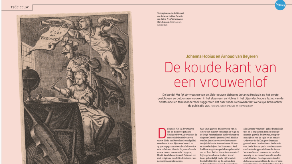 Judith Brouwer en Harm Nijboer hebben recent in Gen.magazine (2025-1, pp. 48-53) een artikel gepubliceerd over hun zoektochten in de archieven naar Hobius en vooral ook: haar echtgenoot. Dat blijkt nogal een ‘boef’ te zijn geweest, in hun woorden, die meermaals in aanraking kwam met justitie vanwege geweldpleging, schulden, en het zwanger maken van een jonge vrouw. De laatste zaak speelde kort na Hobius’ overlijden. In hun artikel beschouwen Brouwer en Nijboer de postume publicatie van Hobius’ werk dan ook niet als een oprecht eerbetoon aan zijn overleden vrouw, maar als een ‘goedmakertje’ richting de familie Hobius. Een andere man, door de weduwnaar betrokken bij de publicatie als editeur, was Jan Harmensz. Krul. Ook hij zal niet enkel uit bewondering voor de overleden Hobius gehandeld hebben, maar tenminste ook blij zijn geweest met de klus omdat deze goed was voor zijn portemonnee én voor zijn reputatie. Hobius was een achternichtje van Cats en in de bundel was ook een gedicht opgenomen van haar aan hem. Wat de rol van Krul precies geweest is, buiten het schrijven van voorwerkteksten, weten we natuurlijk niet, maar al deze nieuwe contextuele informatie maakt dat we misschien toch anders naar Hobius bundel moeten kijken: niet als een eerbetoon aan een jong gestorven talent, maar als een opportune uitgave.