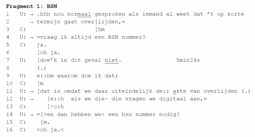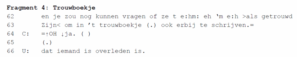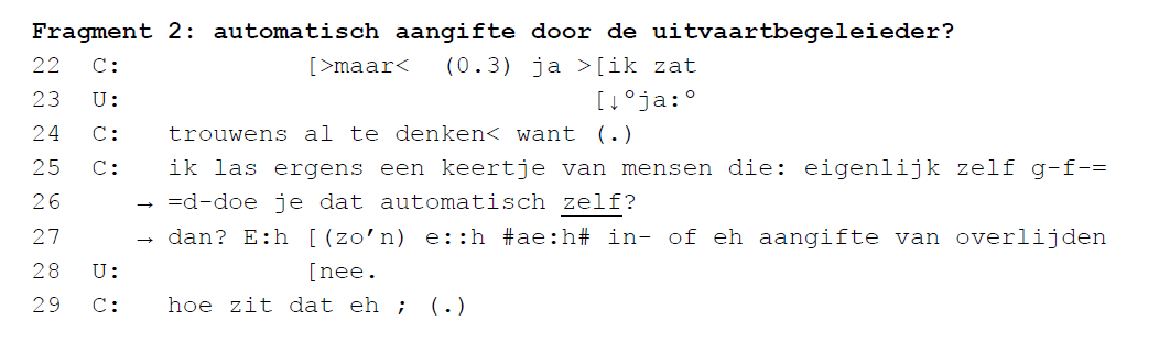 De vraag van de cliënt komt in regel 26: doe je dat (=de aangifte van overlijden) automatisch zelf? Deze vraag wordt gerechtvaardigd door de opmerking van de uitvaartbegeleider in regels 11,12 en 14 waarin de uitvaartbegeleider het heeft over “we”. Toch kost de vraag zichtbaar inspanning.