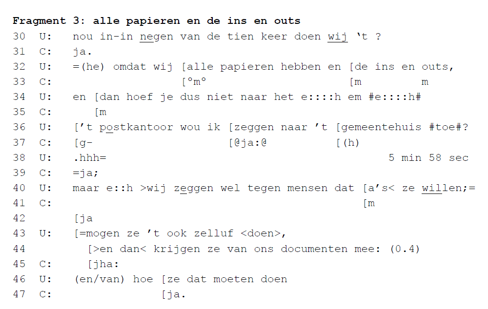 Maar de cliënt is nog niet klaar. De uiteindelijke vraagformulering komt regel 29, als verzoek om uitleg: “Hoe zit dat eh”. “Hoe zit dat” (zonder “eh”) was mogelijk pinnig geweest, maar de “eh” neemt dat weg. Al deze interactionele inspanning (voor- en achteraf) presenteert de vraag als best ingewikkeld, en laat ook zien dat de cliënt werk doet om zichzelf als niet te kritisch te presenteren (wat daarvoor de motivatie ook moge zijn).