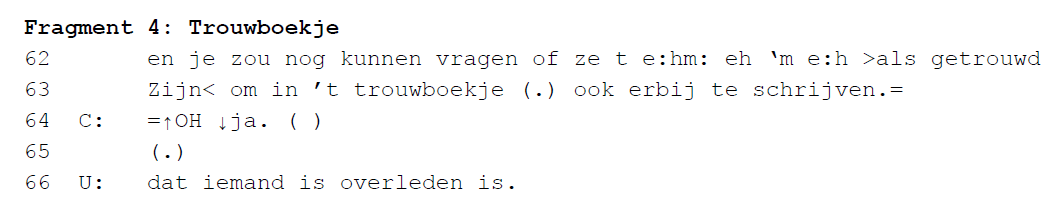 De uitvaartbegeleider presenteert hier optie van een overlijden bij laten schrijven in een trouwboekje met “zou ook nog kunnen”. Hiermee informeert ze de cliënt maar laat aan haar de keuze of dit wel of niet wil. “En” en “nog” presenteren het als nieuwe optie. De cliënt behandelt de informatie als nieuws met “↑OH ja” (regel 64). Het pijltje omhoog geeft stijgende intonatie weer; en de hoofdletters laten zien dat het relatief luid wordt uitgesproken. Deze suggestie functioneert dus als nuttige informatie in het gesprek.