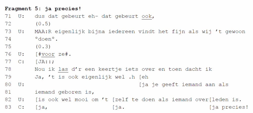 De uitvaartbegeleider staat al na de inademing (weergegeven met “.h”, regel 79) klaar om de gedachten van de cliënt te verwoorden en zo te assisteren. Dit “afmaken voor een ander” is hoe mensen in gesprekken vaak laten zien dat ze elkaar begrijpen en snappen hoe de ander tegen dingen aan kijkt. Dat heeft een interactioneel risico, want je claimt de gedachte van een ander te kennen en daar kan iemand zich tegen verzetten, én je kunt ernaast zitten. Maar in dit geval bevestigt de cliënt volmondig de lezing van de uitvaartbegeleider met twee keer “ja” en een enthousiast “ja precies!” in regel 83. Dus de uitvaartbegeleider heeft de interactioneel “gevaarlijke wateren” om weten te buigen in gezamenlijk begrip van waarom zelf aangifte van overlijden doen een mooie gedachte is.