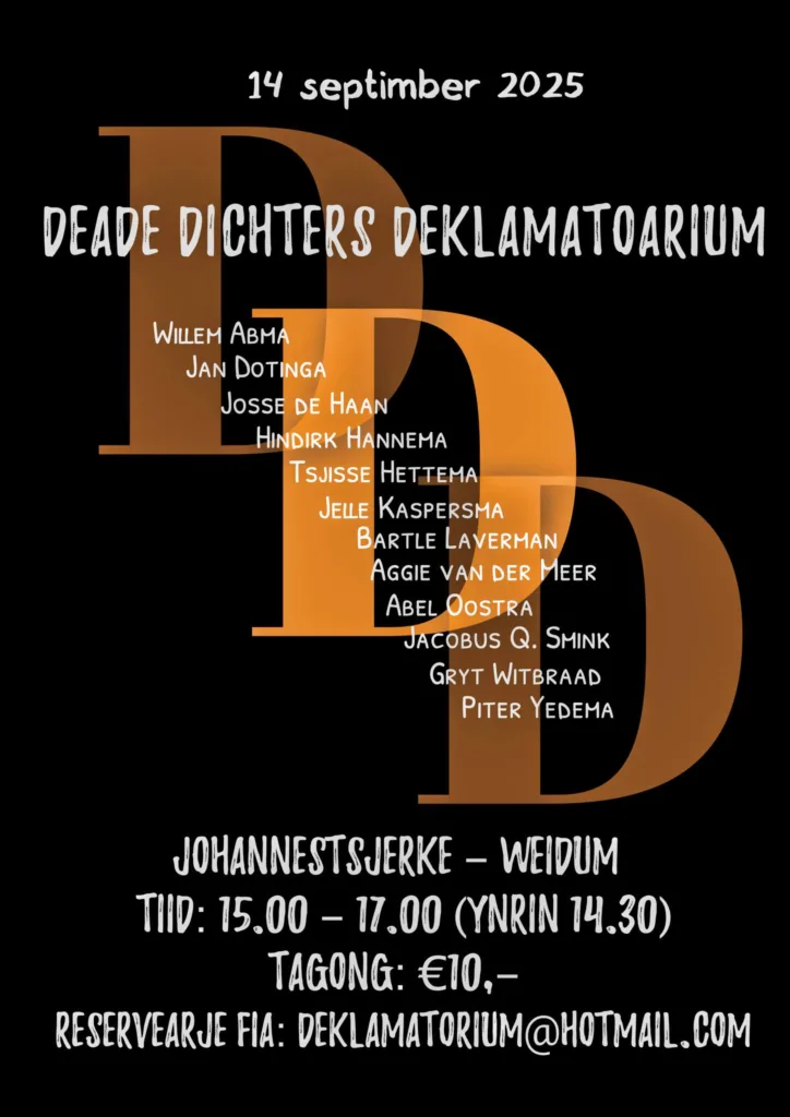 Op sneintemiddei 14 septimber organisearret it DDD-kollektyf yn gearwurking mei húskeamerteater De Wier (Koarnjum) in literêre middei oer Fryske dichters dy’t net mear ûnder ús binne. De middei fynt plak yn de koartlyn restaurearre tsjerke fan Weidum. Njoggen libbene dichters drage poëzy foar fan tolve Fryske dichters dy’t yn de ôfrûne jierren ferstoarn binne. Sy dogge dat ûnder muzikale begelieding fan Axl Hofstede en Wilco Hoekstra. By de foardrachten wurde bylden fan de dichters projektearre.
