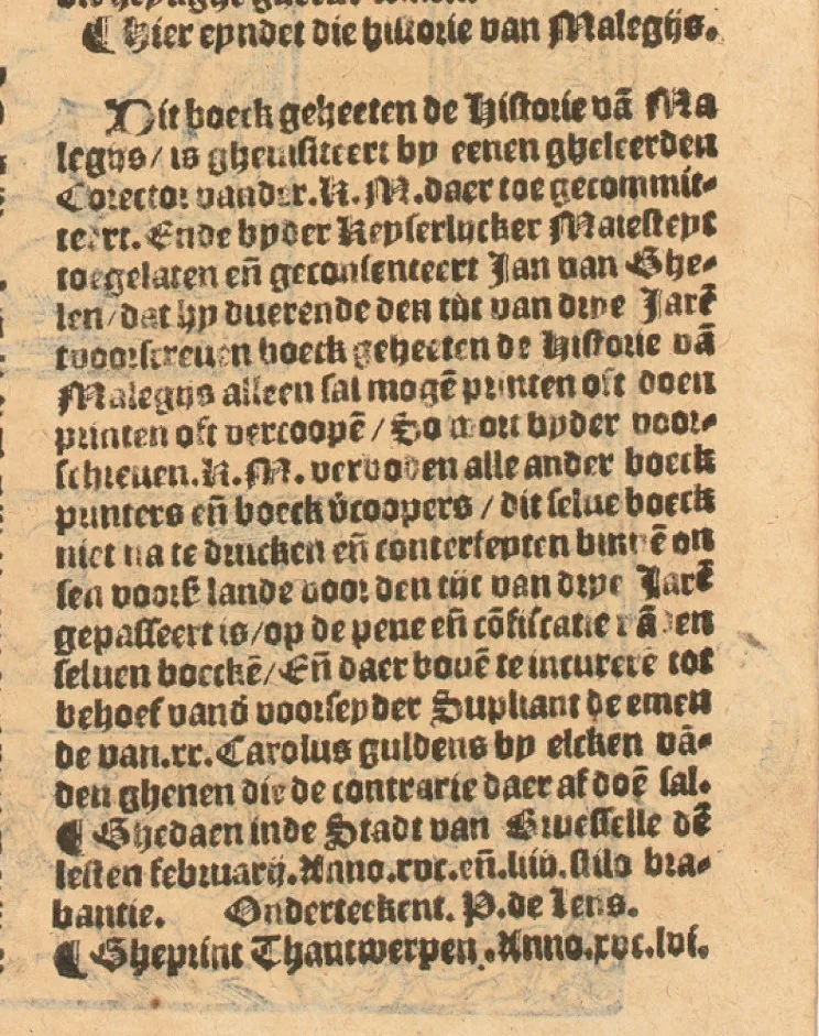 Onzeker is of er al een Historie van Malegijs bestond voordat Jan van Ghelen in 1554 keizerlijke toestemming kreeg van censor/corrector P. de Lens om dit boek te drukken en te verspreiden, alsook het alleenrecht dit te doen voor de tijd van drie jaren, zodat hij zijn investering terug kon verdienen. [3]