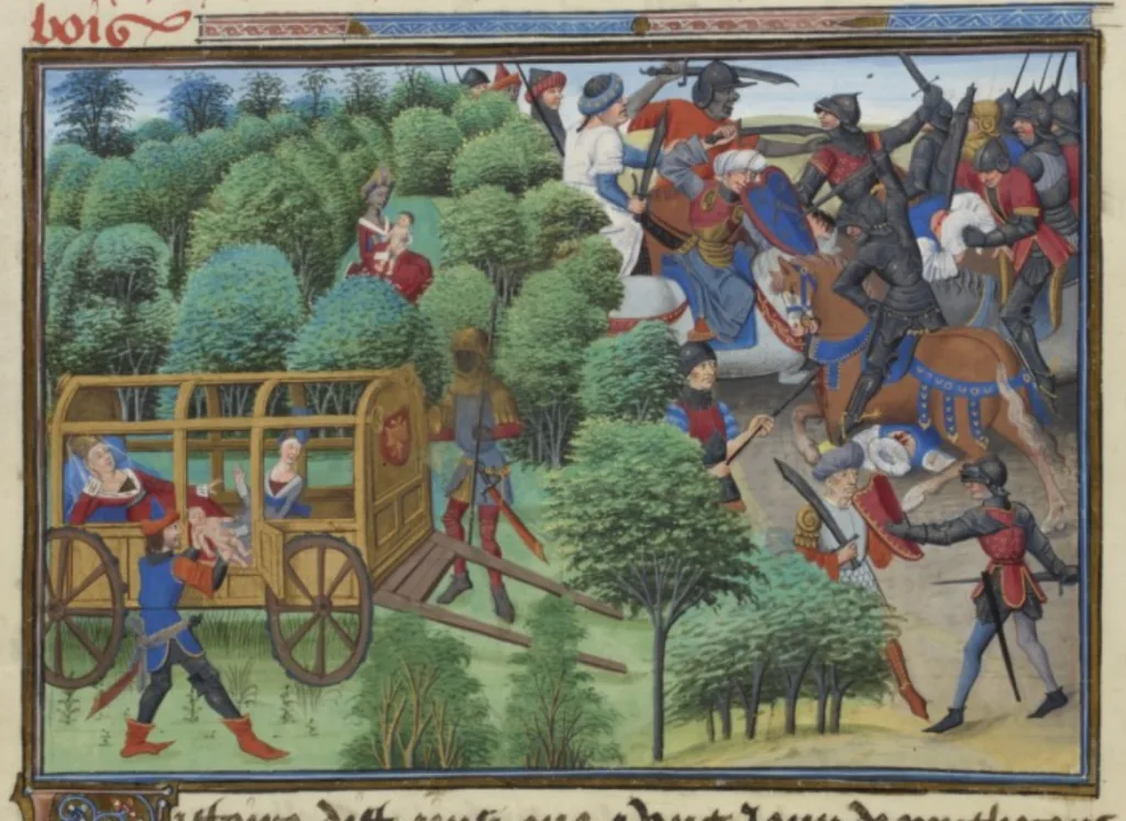 Maugis d’Aigremont is de achteraf geschreven inleiding op het iconische ‘epic of revolt’ Renaud de Montauban, waarin geboorte, jeugd en leven van Maugis verteld worden: hoe hij, evenals zijn tweelingbroer Vivien, direct na zijn geboorte uit het kraambed geroofd werd door de Saraceense slavin van zijn moeder, die het kind mee wilde nemen naar haar ouderlijk huis. Op de afbeelding hieronder ziet u onder de koets met daarin de net bevallen hertogin in gezelschap van haar zuster Ysane, de dief Tapiniaux, die Vivien (lett. ‘hij die zal leven’) ontvoert, en boven de koets de slavin met Maugis en op de achtergrond de hertog die zich dapper verweert tegen de Saracenen die hun dagje aan het strand bederven.