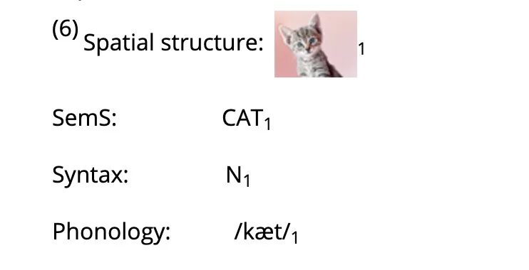 De fonologie is een aanduiding van hoe het woord kat klinkt (in dit plaatje in het Engels). De syntactische informatie is (in ieder geval) dat het een zelfstandig naamwoord is (N betekent nomen; in het Nederlands zou hier ook nog de informatie moeten staan dat het gaat over een de-woord). De ‘semantische’ informatie is bijvoorbeeld dat het gaat over een levend wezen, zodat we aan katten kunnen toeschrijven dat ze slapen of sluipen (en muizen vangen, miauwen, spinnen en blazen) en dat je naar ze verwijst met hij of zij. Dit is het soort informatie waarmee we woorden in categorieën in kunnen delen: katten zijn in dit opzichte hetzelfde als honden, mensen, eenhoorns enzovoort.