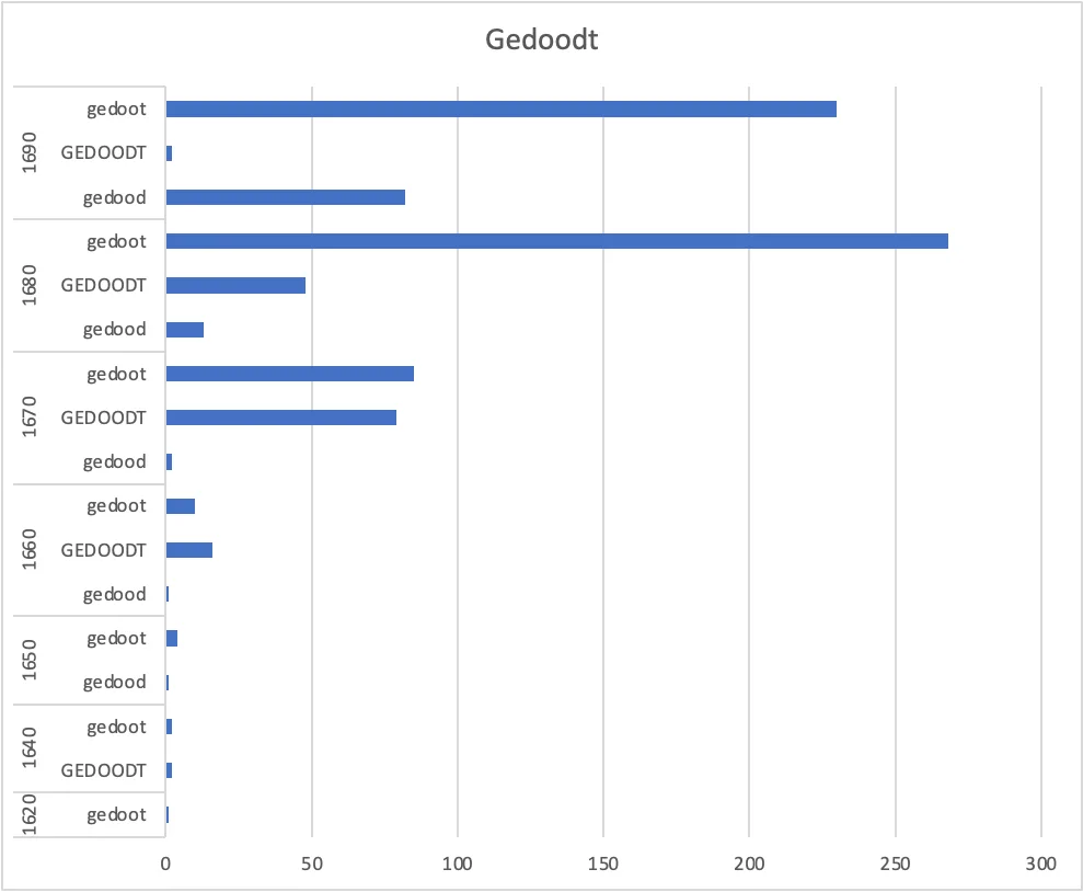 Uit Figuur 5 blijkt dat in het decennium 1640 gedoodt en gedoot in de kranten ongeveer even vaak (en beide heel zelden) voorkomen, terwijl in het decennium 1650 de voorkeurspelling van de Statenvertalers gedoodt überhaupt niet voorkomt, maar in plaats daarvan wel voor het eerst de gelijkvormige spelling gedood wordt aangetroffen. In het decennium 1660 heeft gedoodt een lichte overhand (het komt in totaal slechts 16x voor), maar in de daaropvolgende decennia valt de keuze in de meeste kranten op de fonetische spelling gedoot. Het ziet er dus niet naar uit dat de keuze van de Statenvertalers om het voltooid deelwoord van werkwoorden op –d te spellen als –dt navolging kreeg.