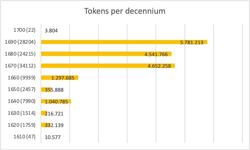 Voordat ik dat voor een aantal taalverschijnselen naga, is het belangrijk erop te wijzen dat de kranten niet gelijkmatig over de tijd zijn verdeeld. In Figuur 1 staan de krantentitels met hun looptijd, in Figuur 2 is het aantal tokens (woordvormen) per decennium weergegeven.
