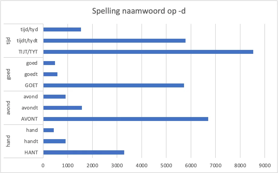 Niet iedereen volgde echter direct dit nieuwe beginsel. De Statenvertalers deden dat bijvoorbeeld niet: ze spelden fonetisch tijt, goet, avont, hant. Uit Figuur 3 blijkt dat ook de krantenuitgevers veelal vasthielden aan een fonetische spelling.