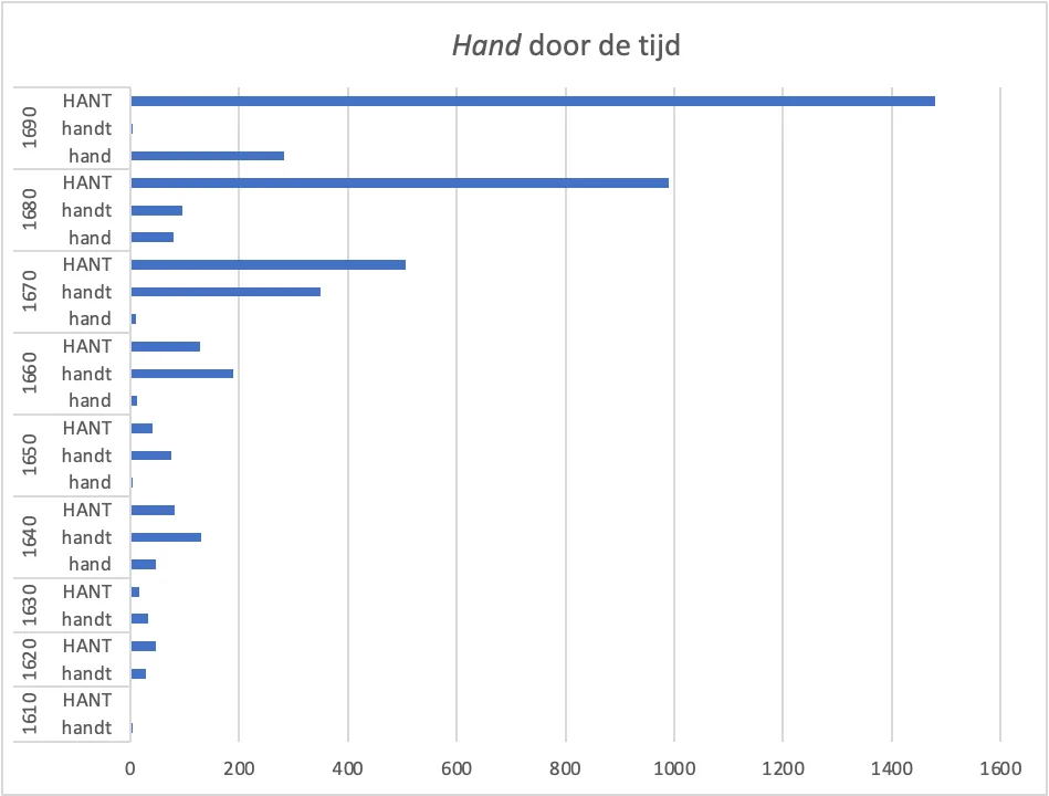 Figuur 4. Chronologisch overzicht van de spelling van ‘hand’ in de kranten